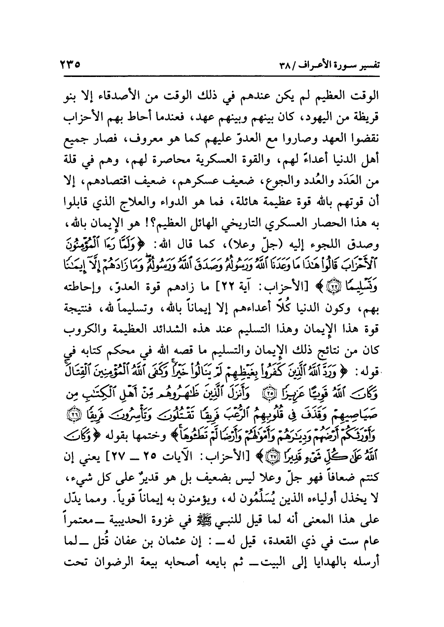 الوقت العظيم لم يكن عندهم في ذلك الوقت من الأصدقاء إلا بنو قريظة من اليهود، كان بينهم وبينهم عهد، فعندما أحاط بهم الأحزاب نقضوا العهد وصاروا مع العدو عليهم كما هو معروف، فصار جميع أهل الدنيا أعداءً لهم، والقوة العسكرية محاصرة لهم، وهم في قلة من العَدَد والعُدد والجوع، ضعيف عسكرهم، ضعيف اقتصادهم، إلا أن قوتهم بالله قوة عظيمة هائلة، فما هو الدواء والعلاج الذي قابلوا به هذا الحصار العسكري التاريخي الهائل العظيم؟! هو الإيمان بالله، وصدق اللجوء إليه (جلّ وعلا)، كما قال الله: {وَلَمَّا رَأَى الْمُؤْمِنُونَ الْأَحْزَابَ قَالُوا هَذَا مَا وَعَدَنَا الله وَرَسُولُهُ وَصَدَقَ الله وَرَسُولُهُ وَمَا زَادَهُمْ إِلَاّ إِيمَاناً وَتَسْلِيماً (٢٢)} [الأحزاب: آية ٢٢] ما زادهم قوة العدوّ، وإحاطته بهم، وكون الدنيا كُلاًّ أعداءهم إلا إيماناً بالله، وتسليماً لله، فنتيجة قوة هذا الإيمان وهذا التسليم عند هذه الشدائد العظيمة والكروب كان من نتائج ذلك الإيمان والتسليم ما قصه الله في محكم كتابه في قوله: {وَرَدَّ الله الَّذِينَ كَفَرُوا بِغَيْظِهِمْ لَمْ يَنَالُوا خَيْراً وَكَفَى الله الْمُؤْمِنِينَ الْقِتَالَ وَكَانَ الله قَوِيّاً عَزِيزاً (٢٥) وَأَنزَلَ الَّذِينَ ظَاهَرُوهُم مِّنْ أَهْلِ الْكِتَابِ مِن صَيَاصِيهِمْ وَقَذَفَ فِي قُلُوبِهِمُ الرُّعْبَ فَرِيقاً تَقْتُلُونَ وَتَأْسِرُونَ فَرِيقاً (٢٦) وَأَوْرَثَكُمْ أَرْضَهُمْ وَدِيَارَهُمْ وَأَمْوَالَهُمْ وَأَرْضاً لَّمْ تَطَؤُوهَا} وختمها بقوله {وَكَانَ الله عَلَى كُلِّ شَيْءٍ قَدِيراً} [الأحزاب: الآيات ٢٥ - ٢٧] يعني إن كنتم ضعافاً فهو جلّ وعلا ليس بضعيف بل هو قدير على كل شيء، لا يخذل أولياءه الذين يُسَلِّمُون له، ويؤمنون به إيماناً قويّاً.