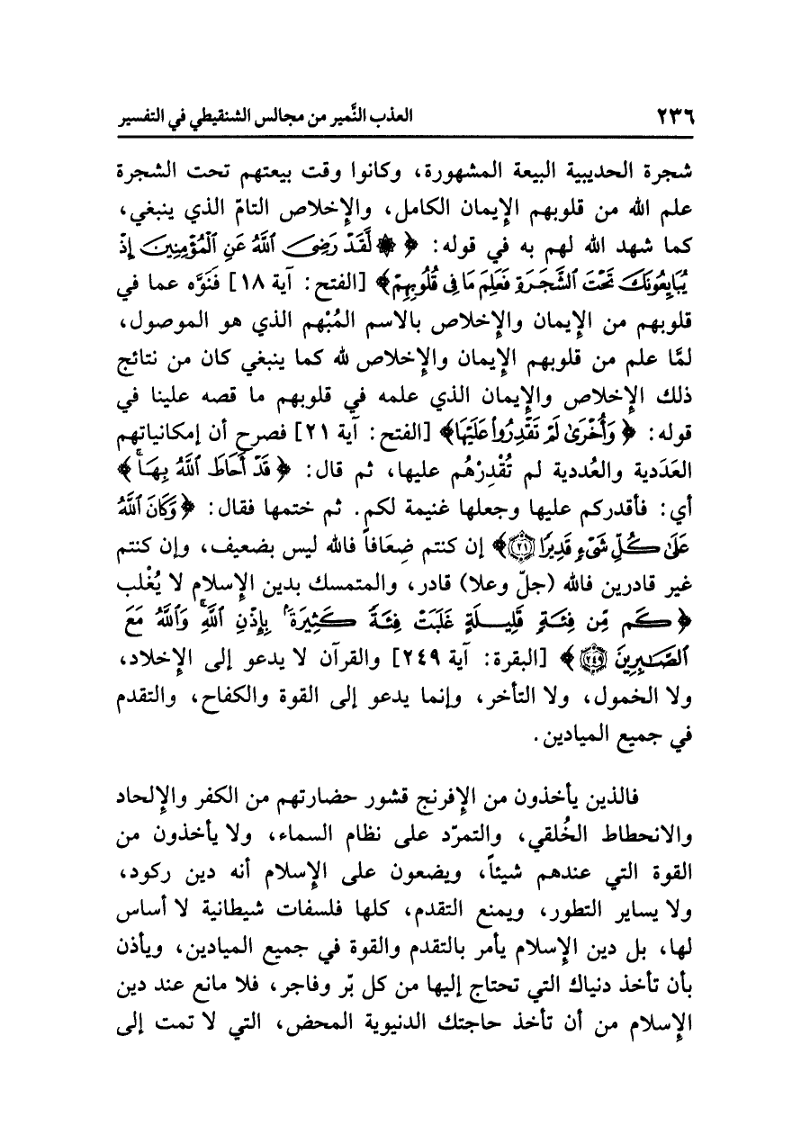 شجرة الحديبية البيعة المشهورة، وكانوا وقت بيعتهم تحت الشجرة علم الله من قلوبهم الإيمان الكامل، والإخلاص التامّ الذي ينبغي، كما شهد الله لهم به في قوله: {لَقَدْ رَضِيَ الله عَنِ الْمُؤْمِنِينَ إِذْ يُبَايِعُونَكَ تَحْتَ الشَّجَرَةِ فَعَلِمَ مَا فِي قُلُوبِهِمْ} [الفتح: آية ١٨] فَنَوَّه عما في قلوبهم من الإيمان والإخلاص بالاسم المُبْهم الذي هو الموصول، لمَّا علم من قلوبهم الإيمان والإخلاص لله كما ينبغي كان من نتائج ذلك الإخلاص والإيمان الذي علمه في قلوبهم ما قصه علينا في قوله: {وَأُخْرَى لَمْ تَقْدِرُوا عَلَيْهَا} [الفتح: آية ٢١] فصرح أن إمكانياتهم العَدَدية والعُددية لم تُقْدِرْهُم عليها، ثم قال: {قَدْ أَحَاطَ اللهُ بِهَا} أي: فأقدركم عليها وجعلها غنيمة لكم. ثم ختمها فقال: {وَكَانَ اللهُ عَلَى كُلِّ شَيْءٍ قَدِيراً} إن كنتم ضِعَافاً فالله ليس بضعيف، وإن كنتم غير قادرين فالله (جلّ وعلا) قادر، والمتمسك بدين الإسلام لا يُغلب {كَم مِّن فِئَةٍ قَلِيلَةٍ غَلَبَتْ فِئَةً كَثِيرَةً بِإِذْنِ الله وَالله مَعَ الصَّابِرِينَ} [البقرة: آية ٢٤٩] والقرآن لا يدعو إلى الإخلاد، ولا الخمول، ولا التأخر، وإنما يدعو إلى القوة والكفاح، والتقدم في جميع الميادين.