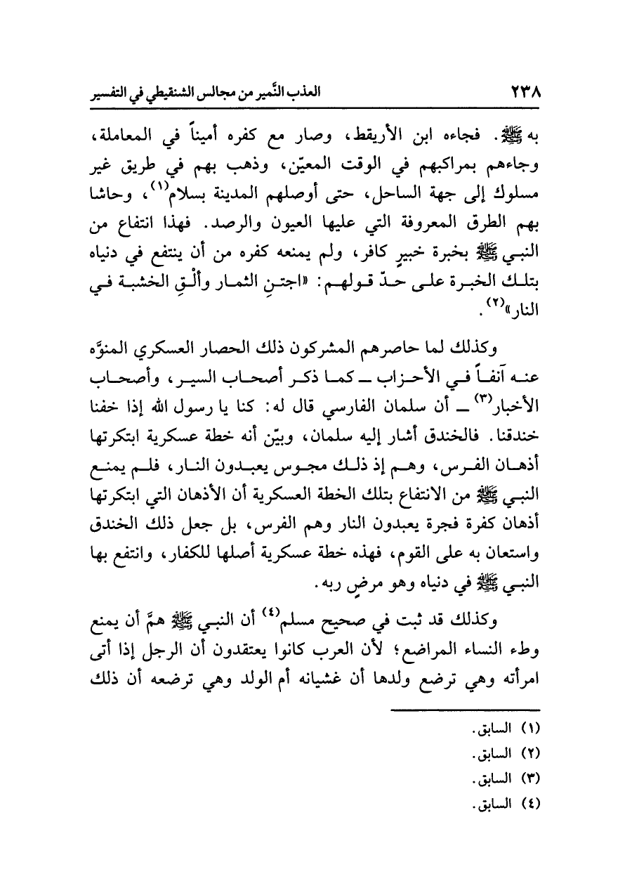 وكذلك لما حاصرهم المشركون ذلك الحصار العسكري المنوَّه عنه آنفاً في الأحزاب - كما ذكر أصحاب السير، وأصحاب الأخبار (¬٣) - أن سلمان الفارسي قال له: كنا يا رسول الله إذا خفنا خندقنا. فالخندق أشار إليه سلمان، وبيّن أنه خطة عسكرية ابتكرتها أذهان الفرس، وهم إذ ذلك مجوس يعبدون النار، فلم يمنع النبي صلى الله عليه وسلم من الانتفاع بتلك الخطة العسكرية أن الأذهان التي ابتكرتها أذهان كفرة فجرة يعبدون النار وهم الفرس، بل جعل ذلك الخندق واستعان به على القوم، فهذه خطة عسكرية أصلها للكفار، وانتفع بها النبي صلى الله عليه وسلم في دنياه وهو مرضٍ ربه.