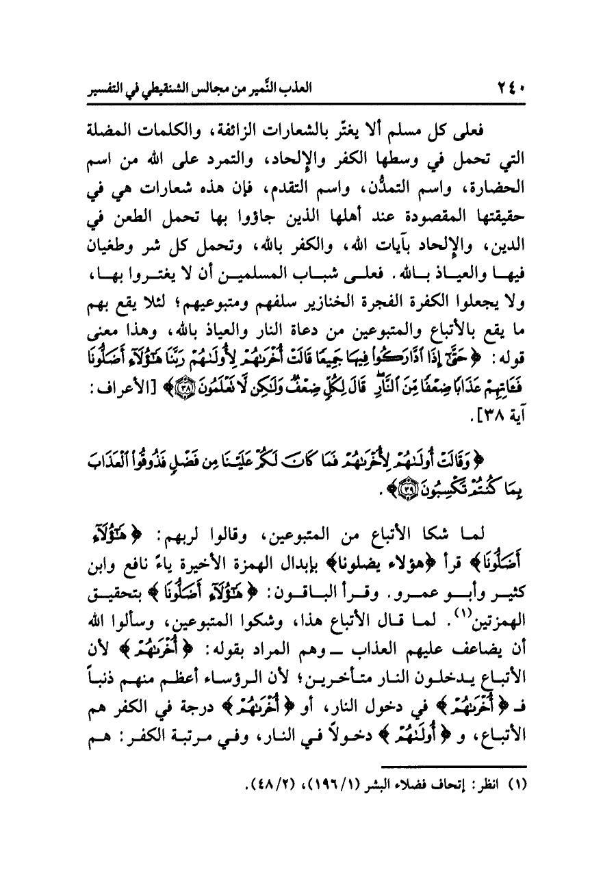 فعلى كل مسلم ألا يغتر بالشعارات الزائفة، والكلمات المضلة التي تحمل في وسطها الكفر والإلحاد، والتمرد على الله من اسم الحضارة، واسم التمدُّن، واسم التقدم، فإن هذه شعارات هي في حقيقتها المقصودة عند أهلها الذين جاءوا بها تحمل الطعن في الدين، والإلحاد في آيات الله، والكفر بالله، وتحمل كل شر وطغيان فيها والعياذ بالله. فعلى شباب المسلمين أن لا يغتروا بها، ولا يجعلوا الكفرة الفجرة الخنازير سلفهم ومتبوعيهم؛ لئلا يقع بهم ما يقع بالأتباع والمتبوعين من دعاة النار والعياذ بالله، وهذا معنى قوله: {حَتَّى إِذَا ادَّارَكُواْ فِيهَا جَمِيعاً قَالَتْ أُخْرَاهُمْ لأُولَاهُمْ رَبَّنَا هَؤُلاء أَضَلُّونَا فَآتِهِمْ عَذَاباً ضِعْفاً مِّنَ النَّارِ قَالَ لِكُلٍّ ضِعْفٌ وَلَكِن لَاّ تَعْلَمُونَ} [الأعراف: آية ٣٨].