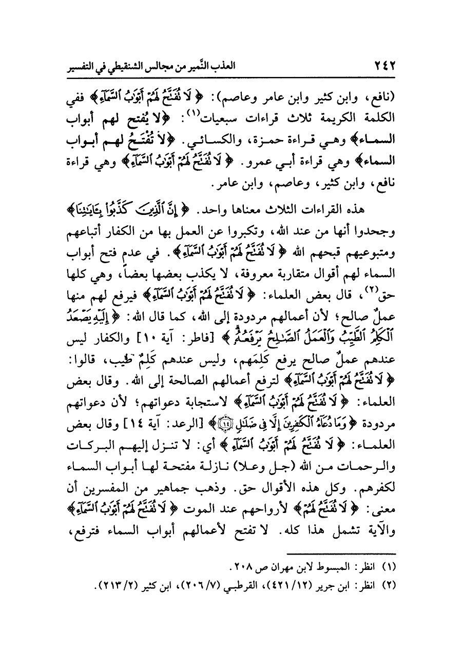 (نافع، وابن كثير، وابن عامر، وعاصم): {لَا تُفَتَّحُ لَهُمْ أَبْوَابُ السَّمَاء} ففي الكلمة الكريمة ثلاث قراءات سبعيات (¬١): {لا يُفْتَح لهم أبواب السماء} وهي قراءة حمزة، والكسائي. {لا تُفْتَحُ لهم أبواب السماء} وهي قراءة أبي عمرو. {لَا تُفَتَّحُ لَهُمْ أَبْوَابُ السَّمَاء} وهي قراءة نافع، وابن كثير، وعاصم، وابن عامر. هذه القراءات الثلاث معناها واحد.