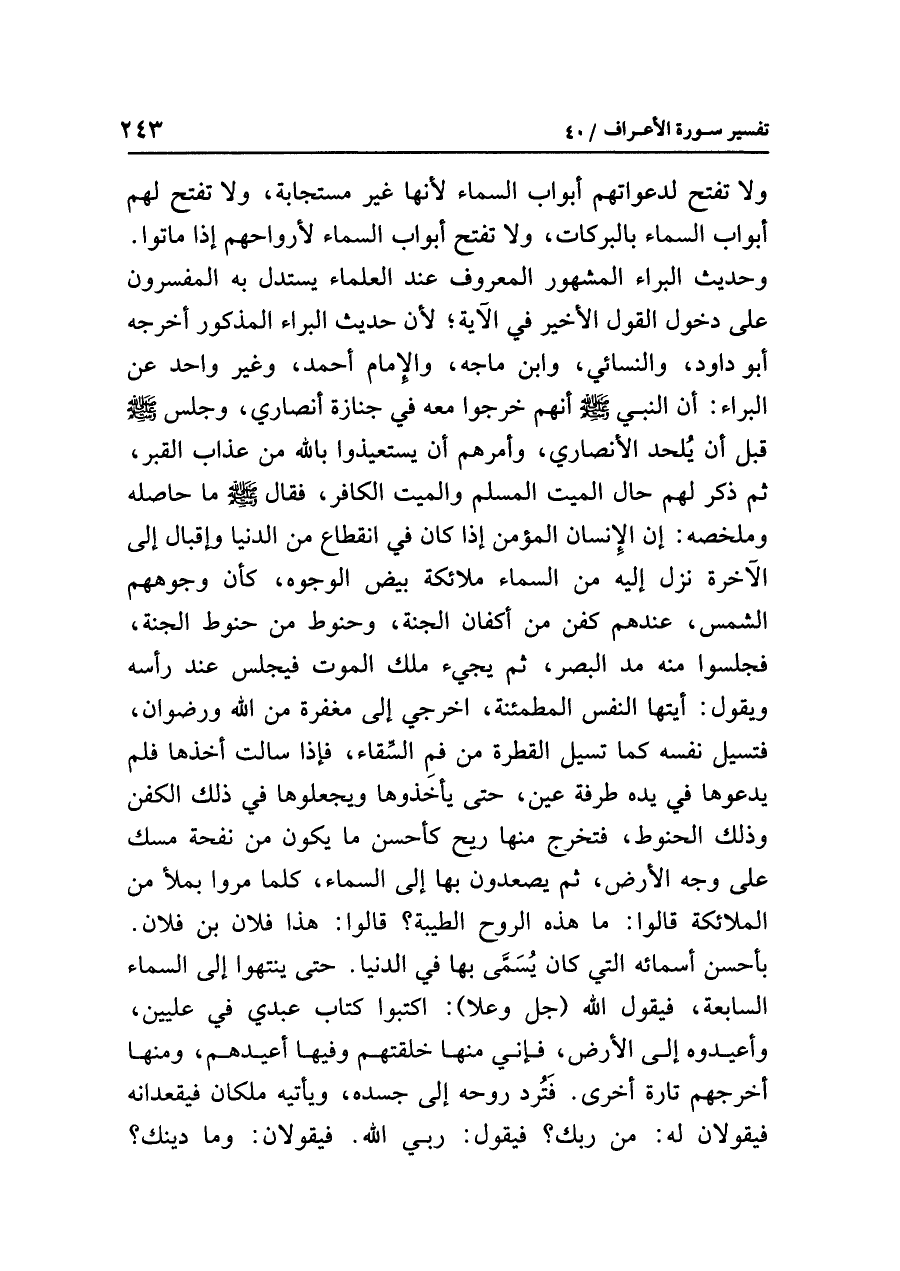 وحديث البراء المشهور المعروف عند العلماء يستدل به المفسرون على دخول القول الأخير في الآية؛ لأن حديث البراء المذكور أخرجه أبو داود، والنسائي، وابن ماجه، والإمام أحمد، وغير واحد عن البراء: أن النبي صلى الله عليه وسلم أنهم خرجوا معه في جنازة أنصاري، وجلس صلى الله عليه وسلم قبل أن يُلحد الأنصاري، وأمرهم أن يستعيذوا بالله من عذاب القبر، ثم ذكر لهم حال الميت المسلم والميت الكافر، فقال صلى الله عليه وسلم ما حاصله وملخَّصه: إن الإنسان المؤمن إذا كان في انقطاع من الدنيا وإقبال إلى الآخرة نزل إليه من السماء ملائكة بيض الوجوه، كأن وجوههم الشمس، عندهم كفن من أكفان الجنة، وحنوط من حنوط الجنة، فجلسوا منه مد البصر، ثم يجيء ملك الموت فيجلس عند رأسه ويقول: أيتها النفس المطمئنة، اخرجي إلى مغفرة من الله ورضوان، فتسيل نفسه كما تسيل القطرة من فمِ السِّقاء، فإذا سالت أخذها فلم يدعوها في يده طرفة عين، حتى يأخذوها ويجعلوها في ذلك الكفن وذلك الحنوط، فتخرج منها ريح كأحسن ما يكون من نفحة مسك على وجه الأرض، ثم يصعدون بها إلى السماء، كلما مروا بملأ من الملائكة قالوا: ما هذه الروح الطيبة؟ قالوا: هذا فلان بن فلان، بأحسن أسمائه التي كان يُسَمَّى بها في الدنيا. حتى ينتهوا إلى السماء السابعة، فيقول الله (جل وعلا): اكتبوا كتاب عبدي في عليين، وأعيدوه إلى الأرض، فإني منها خلقتهم وفيها أعيدهم، ومنها أخرجهم تارة أخرى. فَترد روحه إلى جسده، ويأتيه ملكان فيقعدانه فيقولان له: مَنْ رَبُّكَ؟ فيقول: ربي الله. فيقولان: وما دينك؟