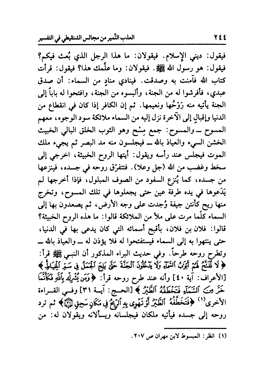 ثم إن الكافر إذا كان في انقطاع من الدنيا وإقبال إلى الآخرة نزل إليه من السماء ملائكة سود الوجوه، معهم المسوح - والمسوح: جمع مِسْح وهو الثوب الخلق البالي الخبيث الخشن السيئ والعياذ بالله- فيجلسون منه مد البصر ثم يجيء ملك الموت فيجلس عند رأسه ويقول: أيتها الروح الخبيثة، اخرجي إلى سخط وغضب من الله (جل وعلا). فتتفرّق روحه في جسده، فينزعها من جسده كما يُنزع السفود من الصوف المبلول، فإذا أخرجها لم يَدَعوها في يده طرفة عين حتى يجعلوها في تلك المسوح، وتخرج منها ريح كأنتن جيفة وُجدت على وجه الأرض؛ ثم يصعدون بها إلى السماء كلّما مرت على ملأ من الملائكة قالوا: ما هذه الروح الخبيثة؟ قالوا: فلان بن فلان، بأقبح أسمائه التي كان يدعى بها في الدنيا، حتى ينتهوا به إلى السماء فيستفتحوا له فلا يؤذن له -والعياذ بالله- وتطرح روحه طرحاً، وفي حديث البراء المذكور أن النبي صلى الله عليه وسلم قرأ: {لَا تُفَتَّحُ لَهُمْ أَبْوَابُ السَّمَاء وَلَا يَدْخُلُونَ الْجَنَّةَ حَتَّى يَلِجَ الْجَمَلُ فِي سَمِّ الْخِيَاطِ} [الأعراف: آية ٤٠] وأنه عند طرح روحه قرأ: {وَمَن يُشْرِكْ بِالله فَكَأَنَّمَا خَرَّ مِنَ السَّمَاء فَتَخْطَفُهُ الطَّيْرُ} [الحج: آية ٣١] وفي القراءة الأخرى (¬١) {فَتَخَطَّفُهُ الطَّيْرُ أَوْ تَهْوِي بِهِ الرِّيحُ فِي مَكَانٍ سَحِيقٍ} ثم ترد روحه إلى جسده ويأتيه ملكان فيجلسانه ويسألانه ويقولان: من