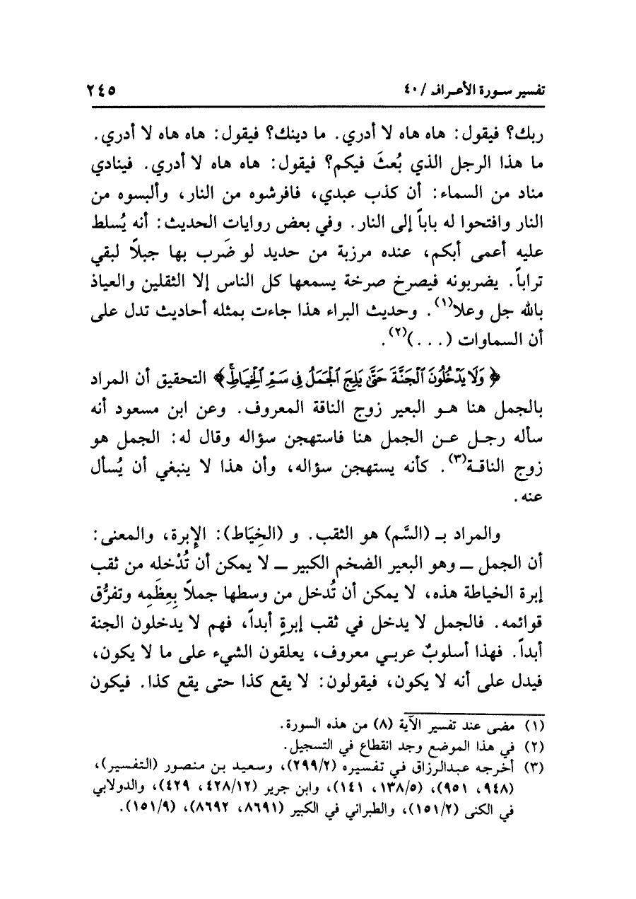 {وَلَا يَدْخُلُونَ الْجَنَّةَ حَتَّى يَلِجَ الْجَمَلُ فِي سَمِّ الْخِيَاطِ} التحقيق أن المراد بالجمل هنا هو البعير زوج الناقة المعروف. وعن ابن مسعود أنه سأله رجل عن الجمل هنا فاستهجن سؤاله وقال له: الجمل هو زوج الناقة (¬٣). كأنه يستهجن سؤاله، وأن هذا لا ينبغي أن يُسأل عنه.