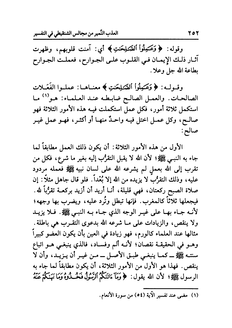 وقوله: {وَعَمِلُواْ الصَّالِحَاتِ} معناها: عملوا الفعلات الصالحات. والعمل الصالح ضابطه عند العلماء: هو (¬١) ما استكمل ثلاثة أمور، فكل عمل استكملت فيه هذه الأمور الثلاثة فهو صالح، وكل عمل اختل فيه واحدٌ منها أو أكثر، فهو عمل غير صالح: