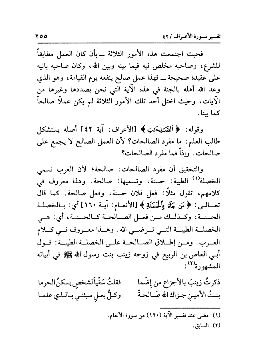 وقوله: {الصَّالِحَات} [الأعراف: آية ٤٢] أصله يستشكل طالب العلم: ما مفرد الصالحات؟ لأن العمل الصالح لا يجمع على صالحات. وإذاً فما مفرد الصالحات؟