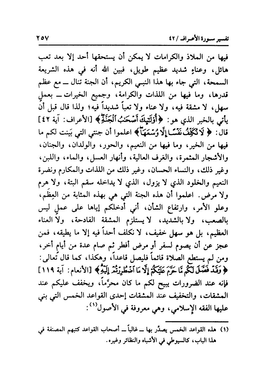 فيها من الملاذ والكرامات لا يمكن أن يستحقها أحد إلا بعد تعب هائل، وعناء شديد عظيم طويل، فبين الله أنه في هذه الشريعة السمحة التي جاء بها هذا النبي الكريم، أن الجنة تنال -مع عظم قدرها، وما فيها من اللذات والكرامة، وجميع الخيرات- بعملٍ سهل، لا مشقة فيه، ولا عناء ولا تعباً شديداً فيه؛ ولذا قال قبل أن يأتي بالخبر الذي هو: {أُولَئِكَ أَصْحَابُ الْجَنَّةِ} [الأعراف: آية ٤٢] قال: {لَا نُكَلِّفُ نَفْساً إِلَاّ وُسْعَهَا} اعلموا أن جنتي التي بَينت لكم ما فيها من الخير، وما فيها من النعيم، والحور، والولدان، والجنان، والأشجار المثمرة، والغرف العالية، وأنهار العسل، والماء، واللبن، والنساء الحسان، وغير ذلك من اللذات والمكارم ونضرة النعيم والخلود الذي لا يزول، الذي لا يداخله سقم ألبتة، ولا هرم ولا مرض. اعلموا أن هذه الجنة التي هي بهذه المثابة من العظَم، وعلو الأمر، وارتفاع الشأن، أني أدخلكم إياها على عمل ليس بالصعب، ولا بالشديد، لا يستلزم المشقة الفادحة، ولا العناء العظيم، بل هو سهل خفيف، لا نكلف أحداً فيه إلا ما يطيقه، فمن عجز عن أن يصوم لسفر أو مرض أفطر ثم صام عدة من أيام أُخر، ومن لم يستطع الصلاة قائماً فليصل قاعداً، وهكذا، كما قال تعالى: {وَقَدْ فَصَّلَ لَكُم مَّا حَرَّمَ عَلَيْكُمْ إِلَاّ مَا اضْطُرِرْتُمْ إِلَيْهِ} [الأنعام: آية ١١٩] فإنه عند الضرورات يبيح لكم ما كان محرَّماً، ويخفف عليكم عند المشقات، والتخفيف عند المشقات إحدى القواعد الخمس التي بني عليها الفقه الإسلامي، وهي معروفة في الأصول (¬١):