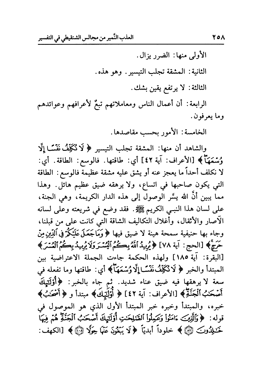 والشاهد أن منها: المشقة تجلب التيسير {لَا نُكَلِّفُ نَفْساً إِلَاّ وُسْعَهَا} [الأعراف: آية ٤٢] أي: طاقتها. فالوسع: الطاقة. أي: لا نكلف أحداً ما يعجز عنه أو يشق عليه مشقة عظيمة، فالوسع: الطاقة التي يكون صاحبها في اتساع، ولا يرهقه ضيق عظيم هائل. وهذا مما يبين أنَّ الله يسَّر الوصول إلى هذه الدار الكريمة، وهي الجنة، على لسان هذا النبي الكريم صلى الله عليه وسلم. فقد وضع في شريعته وعلى لسانه الآصار والأثقال، وأغلال التكاليف الشاقة التي كانت على مَنْ قَبْلَنَا، وجاء بها حنيفيَّةً سَمْحَةً هيِّنَةً لا ضيق فيها {وَمَا جَعَلَ عَلَيْكُمْ فِي الدِّينِ مِنْ حَرَجٍ} [الحج: آية ٧٨] {يُرِيدُ الله بِكُمُ الْيُسْرَ وَلَا يُرِيدُ بِكُمُ الْعُسْرَ} [البقرة: آية ١٨٥] ولهذه الحكمة جاءت الجملة الاعتراضية بين المبتدأ والخبر {لَا نُكَلِّفُ نَفْساً إِلَاّ وُسْعَهَا} أي: طاقتها وما تفعله في سعة لا يرهقها فيه ضيق وعناء شديد. ثم جاء بالخبر: {أُولَئِكَ أَصْحَابُ الْجَنَّةِ} [الأعراف: آية ٤٢] {أُولَئِكَ} مبتدأ و {أَصْحَابُ} خبره، والمبتدأ وخبره خبر المبتدأ الأول الذي هو الموصول في قوله: {وَالَّذِينَ آمَنُواْ وَعَمِلُواْ الصَّالِحَاتِ أُولَئِكَ أَصْحَابُ الْجَنَّةِ هُمْ فِيهَا خَالِدُونَ (٨٢)} خلوداً أبديّاً {لَا يَبْغُونَ عَنْهَا حِوَلاً} [الكهف: