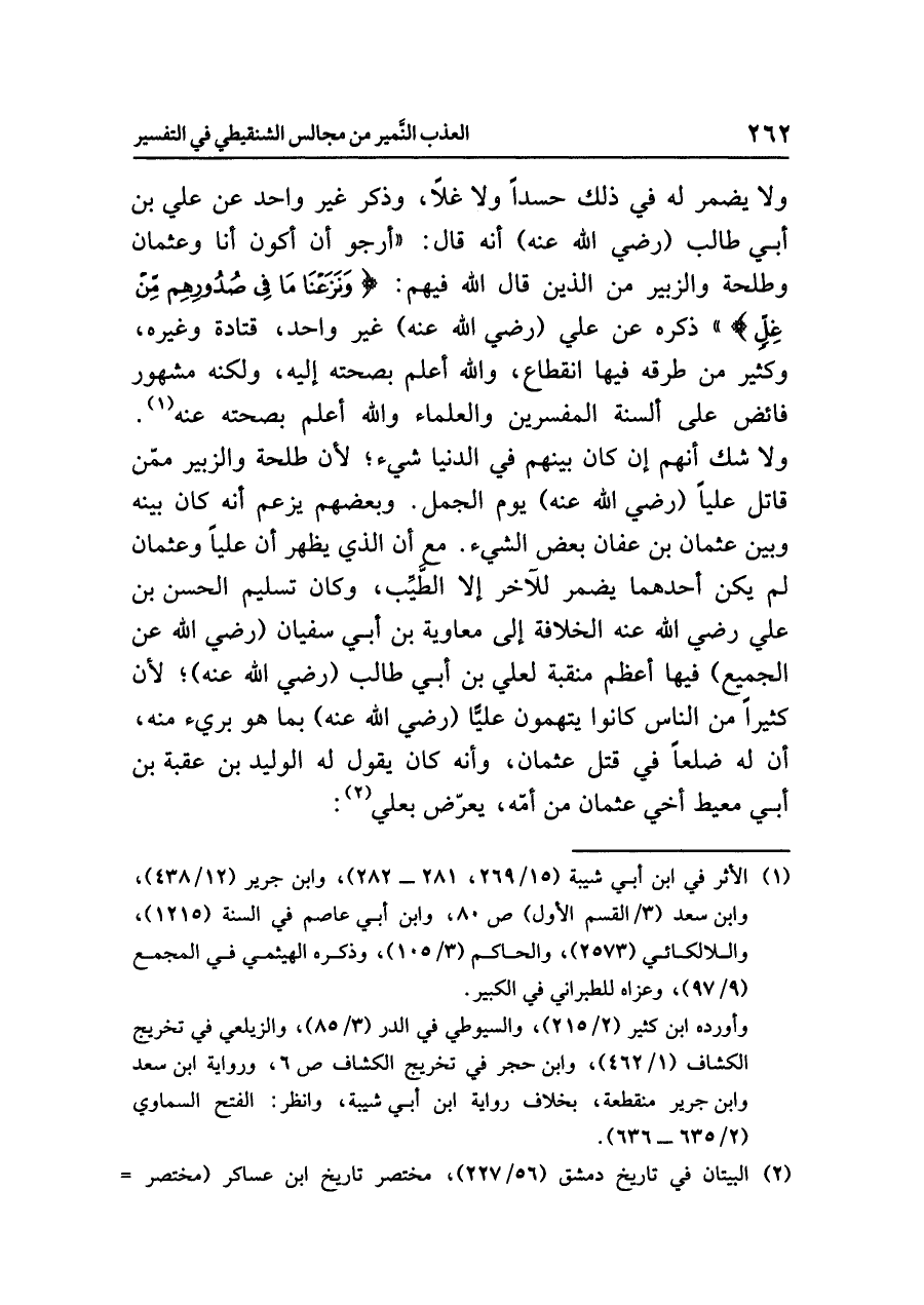 ولا شك أنهم إن كان بينهم في الدنيا شيء؛ لأن طلحة والزبير ممّن قاتل عليّاً (رضي الله عنه) يوم الجمل، وبعضهم يزعم أنه كان بينه وبين عثمان بن عفان بعض الشيء، مع أن الذي يظهر أن عليّاً وعثمان لم يكن أحدهما يضمر للآخر إلا الطَّيِّب، وكان تسليم الحسن بن علي رضي الله عنه الخلافة إلى معاوية بن أبي سفيان (رضي الله عن الجميع) فيها أعظم منقبة لعلي بن أبي طالب (رضي الله عنه)؛ لأن كثيراً من الناس كانوا يتهمون عليّاً (رضي الله عنه) بما هو بريء منه، أن له ضلعاً في قتل عثمان، وأنه كان يقول له الوليد بن عقبة بن أبي معيط أخي عثمان من أمّه، يعرّض بعلي (¬٢):