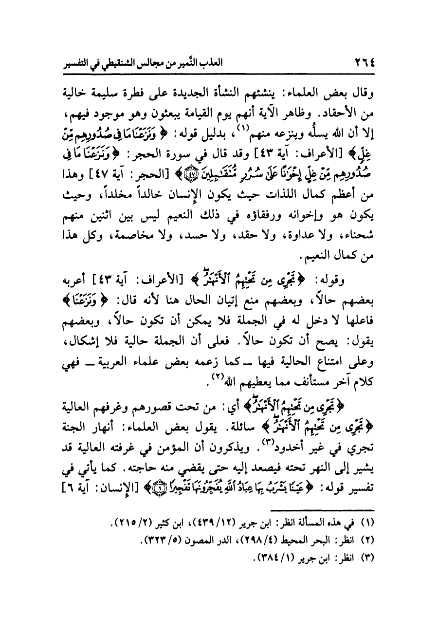 وقوله: {تَجْرِي مِن تَحْتِهِمُ الأَنْهَارُ} [الأعراف: آية ٤٣] أعربه بعضهم حالاً، وبعضهم منع إتيان الحال هنا لأنه قال: {وَنَزَعنَا} فاعلها لا دخل له في الجملة فلا يمكن أن تكون حالاً، وبعضهم يقول: يصح أن تكون حالاً. فعلى أن الجملة حالية فلا إشكال، وعلى امتناع الحالية فيها -كما زعمه بعض علماء العربية- فهي كلام آخر مستأنف مما يعطيهم الله (¬٢).