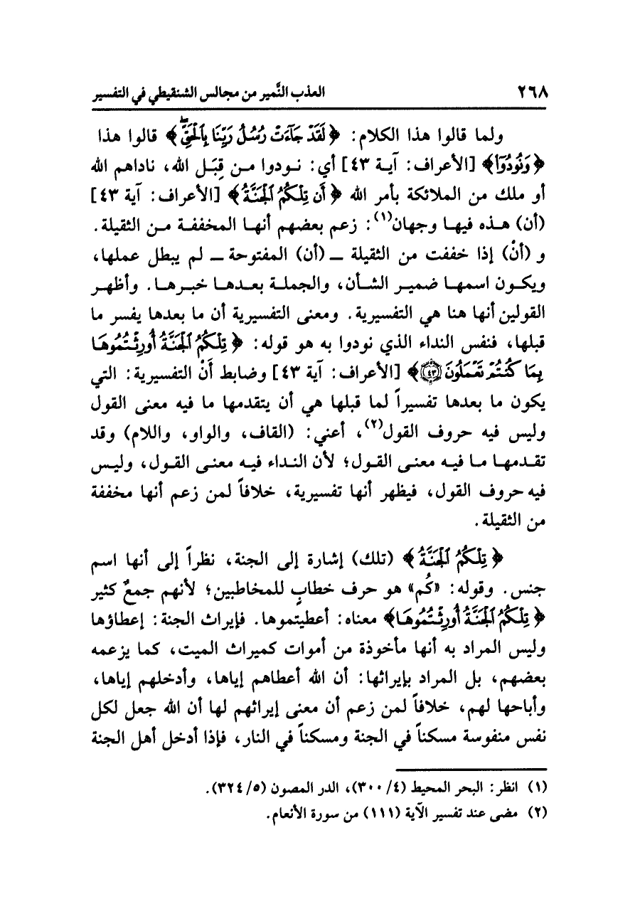 ولما قالوا هذا الكلام: {لَقَدْ جَاءتْ رُسُلُ رَبِّنَا بِالْحَقِّ} قالوا هذا {وَنُودُواْ} [الأعراف: آية ٤٣] أي: نودوا من قِبَل الله، ناداهم الله أو ملك من الملائكة بأمر الله {أَن تِلْكُمُ الْجَنَّةُ} [الأعراف: آية ٤٣] (أن) هذه فيها وجهان (¬١): زعم بعضهم أنها المخففة من الثقيلة. و (أنْ) إذا خففت من الثقيلة - (أن) المفتوحة - لم يبطل عملها، ويكون اسمها ضمير الشأن، والجملة بعدها خبرها. وأظهر القولين أنها هنا هي التفسيرية. ومعنى التفسيرية أن ما بعدها يفسر ما قبلها، فنفس النداء الذي نودوا به هو قوله: {تِلْكُمُ الْجَنَّةُ أُورِثْتُمُوهَا بِمَا كُنتُمْ تَعْمَلُونَ} [الأعراف: آية ٤٣] وضابط أَنْ التفسيرية: التي يكون ما بعدها تفسيراً لما قبلها هي أن يتقدمها ما فيه معنى القول وليس فيه حروف القول (¬٢)، أعني: (القاف، والواو، واللام) وقد تقدمها ما فيه معنى القول؛ لأن النداء فيه معنى القول، وليس فيه حروف القول، فيظهر أنها تفسيرية، خلافاً لمن زعم أنها مخففة من الثقيلة.