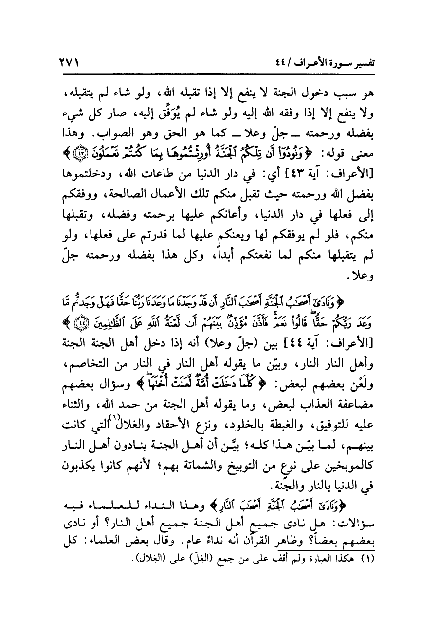 هو سَبَب دخول الجنة لا ينفع إلا إذا تَقَبَّلَه الله، ولو شاء لم يَتَقَبَّلْهُ، ولا ينفع إلا إذا وفَّقَ الله إليه ولو شاء لم يوَفِّق إليه، صار كل شي بفضله ورحمته -جلّ وعلا- كما هو الحق وهو الصواب. وهذا معنى قوله: {وَنُودُواْ أَن تِلْكُمُ الْجَنَّةُ أُورِثْتُمُوهَا بِمَا كُنتُمْ تَعْمَلُونَ} [الأعراف: آية ٤٣] أي: في دار الدنيا من طاعات الله، ودخلتموها بفضل الله ورحمته حيث تقبل منكم تلك الأعمال الصالحة، ووفقكم إلى فعلها في دار الدنيا، وأعانكم عليها برحمته وفضله، وتقبلها منكم، فلو لم يوفقكم لها ويعنكم عليها لما قدرتم على فعلها، ولو لم يَتَقَبَّلْهَا منكم لما نفعتكم أبداً، وكل هذا بفضله ورحمته جلّ وعلا.