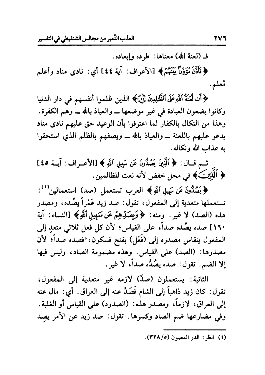 {يَصُدُّونَ عَن سَبِيلِ الله} العرب تستعمل (صد) استعمالين (¬١): تستعملها متعدية إلى المفعول، تقول: صد زيد عَمْراً يصُده، ومصدر هذه (الصد) لا غير. ومنه: {وَبِصَدِّهِمْ عَن سَبِيلِ الله} [النساء: آية ١٦٠] صده يصُده صدّاً، على القياس؛ لأن كل فعل ثلاثي متعدٍّ إلى المفعول ينقاس مصدره إلى (فَعْل) بفتح فسكون، فصده صدّاً؛ لأن مصدرها: (الصد) على القياس. وهذه مضمومة الصاد، وليس فيها إلا الضم. تقول: صده يصُدُّه صدّاً، لا غير.