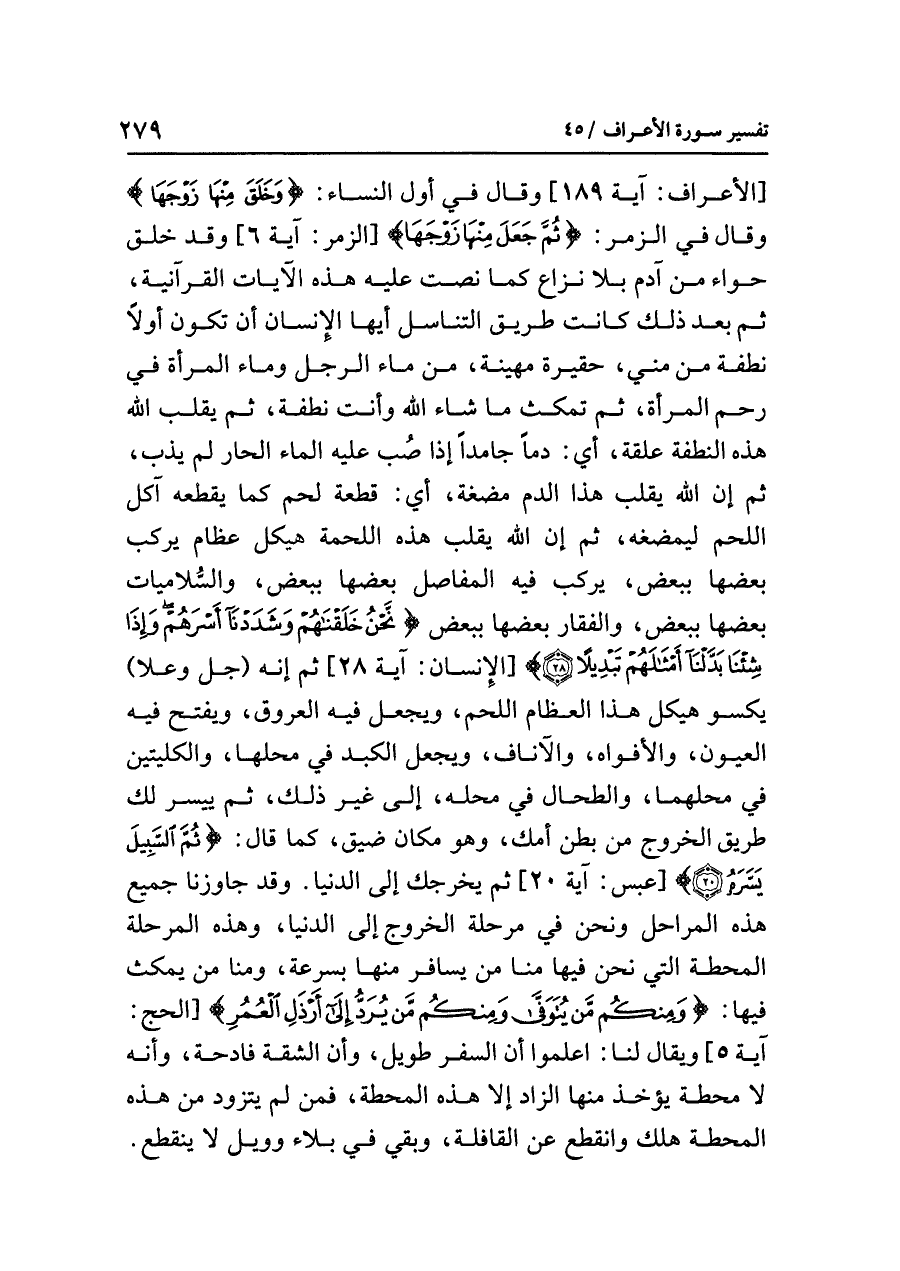 [الأعراف: آية ١٨٩] وقال في أول النساء: {وَخَلَقَ مِنْهَا زَوْجَهَا} وقال في الزمر: {ثُمَّ جَعَلَ مِنْهَا زَوْجَهَا} [الزمر: آية ٦] وقد خلق حواء من آدم بلا نزاع كما نصت عليه هذه الآيات القرآنية، ثم بعد ذلك كانت طريق التناسل أيها الإنسان أن تكون أولاً نطفة من مني حقيرة مهينة، من ماء الرجل وماء المرأة في رحم المرأة، ثم تمكث ما شاء الله وأنت نطفة، ثم يقلب الله هذه النطفة علقة، أي: دماً جامداً إذا صُب عليه الماء الحار لم يذب، ثم إن الله يقلب هذا الدم مضغة، أي: قطعة لحم كما يقطعه آكل اللحم ليمضغه، ثم إن الله يقلب هذه اللحمة هيكل عظام يركب بعضها ببعض، يركب فيه المفاصل بعضها ببعض، والسُّلاميات بعضها ببعض، والفقار بعضها ببعض {نَحْنُ خَلَقْنَاهُمْ وَشَدَدْنَا أَسْرَهُمْ وَإِذَا شِئْنَا بَدَّلْنَا أَمْثَالَهُمْ تَبْدِيلاً (٢٨)} [الإنسان: آية ٢٨] ثم إنه (جل وعلا) يكسو هيكل هذا العظام اللحم، ويجعل فيه العروق، ويفتح فيه العيون، والأفواه، والآناف، ويجعل الكبد في محلها، والكليتين في محلهما، والطحال في محله، إلى غير ذلك، ثم ييسر لك طريق الخروج من بطن أمك، وهو مكان ضيق، كما قال: {ثُمَّ السَّبِيلَ يَسَّرَهُ (٢٠)} [عبس: آية ٢٠] ثم يخرجك إلى الدنيا.