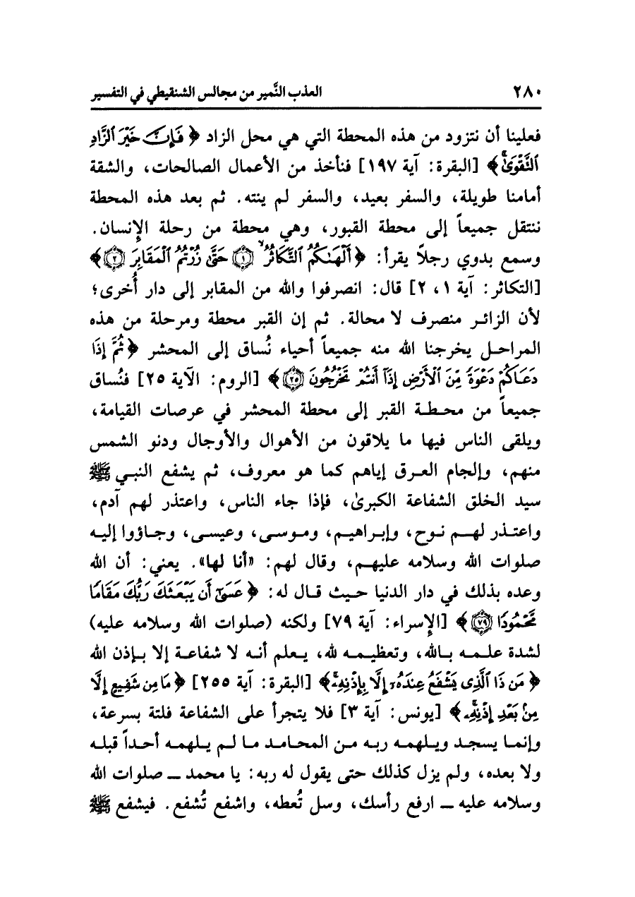فعلينا أن نتزود من هذه المحطة التي هي محل الزاد {وَتَزَوَّدُواْ فَإِنَّ خَيْرَ الزَّادِ التَّقْوَى} [البقرة: آية ١٩٧] فنأخذ من الأعمال الصالحات، والشقة أمامنا طويلة، والسفر بعيد، والسفر لم ينته. ثم بعد هذه المحطة ننتقل جميعاً إلى محطة القبور، وهي محطة من رحلة الإنسان. وسمع بدوي رجلاً يقرأ: {أَلْهَاكُمُ التَّكَاثُرُ (١) حَتَّى زُرْتُمُ الْمَقَابِرَ (٢)} [التكاثر: آية ١] قال: انصرفوا والله من المقابر إلى دار أُخرى؛ لأن الزائر منصرف لا محالة. ثم إن القبر محطة ومرحلة من هذه المراحل يخرجنا الله منه جميعاً أحياء نُساق إلى المحشر {ثُمَّ إِذَا دَعَاكُمْ دَعْوَةً مِّنَ الْأَرْضِ إِذَا أَنتُمْ تَخْرُجُونَ} [الروم: الآية ٢٥] فنُساق جميعاً من محطة القبر إلى محطة المحشر في عرصات القيامة، ويلقى الناس فيها ما يلاقون من الأهوال والأوجال ودنُوّ الشمس منهم، وإلجام العرق إياهم كما هو معروف، ثم يشفع النبي صلى الله عليه وسلم سيد الخلق الشفاعة الكبرى، فإذا جاء الناس، واعتذر لهم آدم، واعتذر لهم نوح، وإبراهيم، وموسى، وعيسى، وجاءوا إليه صلوات الله وسلامه عليهم، وقال لهم: «أنا لها».