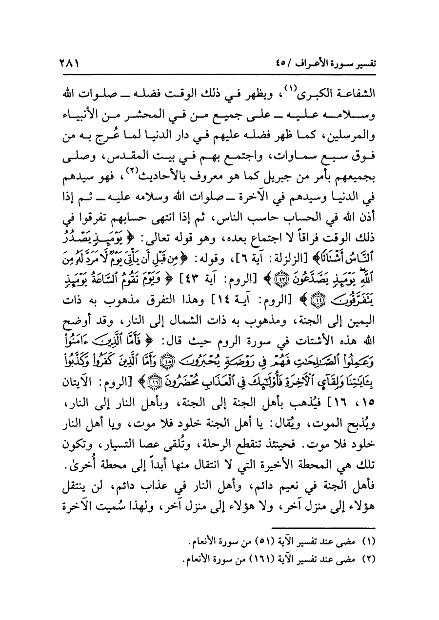 فهو سيدهم في الدنيا وسيدهم في الآخرة -صلوات الله وسلامه عليه- ثم إذا أذن الله في الحساب حاسب الناس، ثم إذا انتهى حسابهم تفرقوا في ذلك الوقت فراقاً لا اجتماع بعده، وهو قوله تعالى: {يَوْمَئِذٍ يَصْدُرُ النَّاسُ أَشْتَاتاً} [الزلزلة: آية ٦] وقوله: {مِّن قَبْلِ أَن يَأْتِيَ يَوْمٌ لَاّ مَرَدَّ لَهُ مِنَ الله يَوْمَئِذٍ يَصَّدَّعُونَ} {وَيَوْمَ تَقُومُ السَّاعَةُ يَوْمَئِذٍ يَتَفَرَّقُونَ (١٤)} [الروم: آية ١٤] وهذا التفرق مذهوب به ذات اليمين إلى الجنة، ومذهوب به ذات الشمال إلى النار، وقد أوضح الله هذه الأشتات في سورة الروم حيث قال: {فَأَمَّا الَّذِينَ آمَنُوا وَعَمِلُوا الصَّالِحَاتِ فَهُمْ فِي رَوْضَةٍ يُحْبَرُونَ (١٥) وَأَمَّا الَّذِينَ كَفَرُوا وَكَذَّبُوا بِآيَاتِنَا وَلِقَاء الْآخِرَةِ فَأُوْلَئِكَ فِي الْعَذَابِ مُحْضَرُونَ (١٦)} [الروم: الآيتان ١٥، ١٦] فيُذهب بأهل الجنة إلى الجنة، وبأهل النار إلى النار، وُيذبح الموت، ويُقال: يا أهل الجنة خلود فلا موت، ويا أهل النار خلود فلا موت. فحينئذ تنقطع الرحلة، وتُلقى عصا التسيار، وتكون تلك هي المحطة الأخيرة التي لا انتقال منها أبداً إلى محطة أخرى. فأهل الجنة في نعيم دائم، وأهل النار في عذاب دائم، لن ينتقل هؤلاء إلى منزل آخر، ولا هؤلاء إلى منزل آخر، ولهذا سُميت الآخرة؛