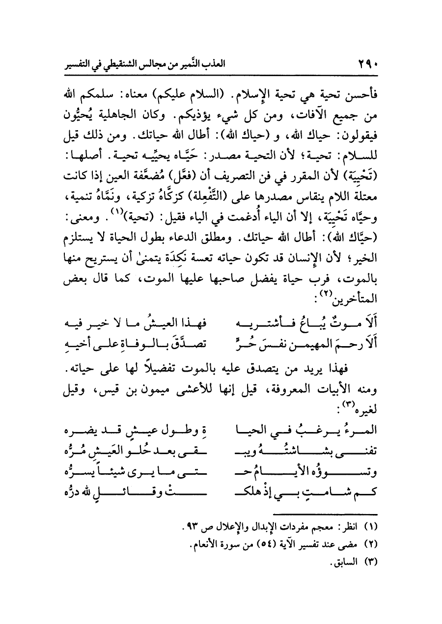 فأحسن تحية هي تحية الإسلام. (السلام عليكم) معناه: سلمكم الله من جميع الآفات، ومن كل شيء يؤذيكم. وكان الجاهلية يُحيُّون فيقولون: حياك الله، و (حياك الله): أطال الله حياتك. ومن ذلك قيل للسلام: تحية؛ لأن التحية مصدر: حَيَّاه يحيِّيه تحية. أصلها: (تَحْيِيَة) لأن المُقَرَّرَ في فن التصريف أن (فعَّل) مُضعَّفة العين إذا كانت معتلة اللامَ ينقاس مصدرها على (التَّفْعِلة) كزكاه تزكية، ونَمَّاهُ تنمية، وحيَّاه تَحْييَة، إلا أن الياء أُدغمت في الياء فقيل: (تحية) (¬١). ومعنى: (حيَّاك الله): أطال الله حياتك. ومطلق الدعاء بطول الحياة لا يستلزم الخير؛ لأن الإنسان قد تكون حياته تعسة نَكِدَة يتمنى أن يستريح منها بالموت، فرب حياة يفضل صاحبها عليها الموت، كما قال بعض المتأخرين (¬٢):