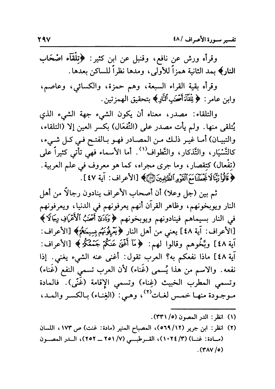 ثم بين (جل وعلا) أن أصحاب الأعراف ينادون رجالاً من أهل النار ويوبخونهم، وظاهر القرآن أنهم يعرفونهم في الدنيا، ويعرفونهم في النار بسيماهم فينادونهم ويوبخونهم {وَنَادَى أَصْحَابُ الأَعْرَافِ رِجَالاً} [الأعراف: آية ٤٨] يعني من أهل النار {مَا أَغْنَى عَنكُمْ جَمْعُكُمْ} [الأعراف: آية ٤٨] وبخُوهم وقالوا لهم: {مَا أَغْنَى عَنكُمْ جَمْعُكُمْ} [الأعراف: آية ٤٨] ماذا نفعكم به؟ العرب تقول: أغنى عنه الشيء يغني: إذا نفعه. والاسم من هذا يُسمى (غَناء) لأن العرب تسمي النفع (غَناء) وتسمي المطرب الخبيث (غِناء) وتسمي الإقامة (غَنىً). فالمادة موجودة منها خمس لغات (¬٢)، وهي: (الغِناء) بالكسر والمد،