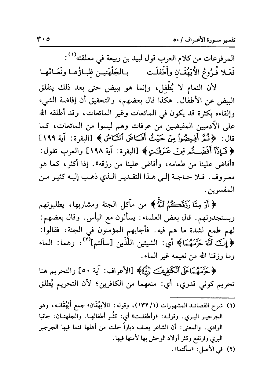 (¬١) شرح القصائد المشهورات (١/ ١٣٢). وقوله: «الأيهُقَان» جمع أَيهُقانة، وهو الجرجير البري. وقوله: «وأطفلت» أي: كثُر أطفالها. والجلهتان: جانبا الوادي. والمعنى: أن الشاعر يصف دياراً خلت من أهلها فنما فيها الجرجير البري وارتفع وكثر أولاد الوحش بها لأمنها فيها.