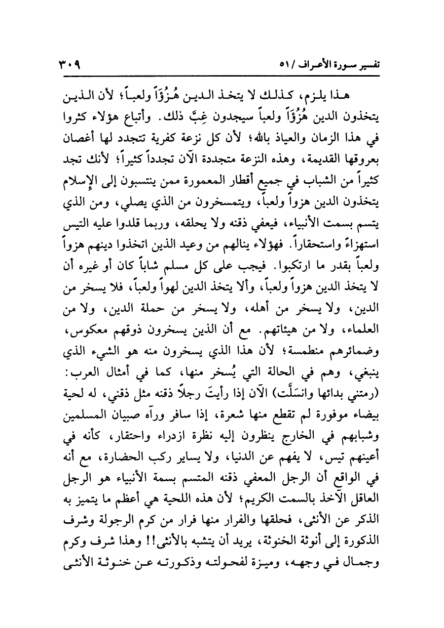 هذا يلزم، كذلك لا يتخذ الدين هُزُؤاً ولعباً؛ لأن الذين يتخذون الدين هُزُؤًا ولعباً سيجدون غِبَّ ذلك. وأتباع هؤلاء كثروا في هذا الزمان والعياذ بالله؛ لأن كل نزعة كفرية تتجدد لها أغصان بعروقها القديمة، وهذه النزعة متجددة الآن تجدداً كثيراً؛ لأنك تجد كثيراً من الشباب في جميع أقطار المعمورة ممن ينتسبون إلى الإسلام يتخذون الدين هزؤاً ولعباً، ويتمسخرون من الذي يصلي، ومن الذي يتسم بسمت الأنبياء، فيعفي ذقنه ولا يحلقه، وربما قلدوا عليه التيس استهزاءً واستحقاراً، فهؤلاء ينالهم من وعيد الذين اتخذوا دينهم هزؤاً ولعباً بقدر ما ارتكبوا، فيجب على كل مسلم شابّاً كان أو غيره أن لا يتخذ الدين هزواً ولعباً، وألا يتخذ الدين لهواً ولعباً، فلا يسخر من الدين، ولا يسخر من أهله، ولا يسخر من حملة الدين، ولا من العلماء، ولا من هيئاتهم. مع أن الذين يسخرون ذوقهم معكوس، وضمائرهم منطمسة؛ لأن هذا الذي يسخرون منه هو الشيء الذي ينبغي، وهم في الحالة التي يُسخر منها، كما في أمثال العرب: (رمتني بدائها وانسَلَّت) الآن إذا رأيتَ رجلاً ذقنه مثل ذقني، له لحية بيضاء موفورة لم تقطع منها شعرة، إذا سافر ورآه صبيان المسلمين وشبابهم في الخارج ينظرون إليه نظرة ازدراء واحتقار، كأنه في أعينهم تيس، لا يفهم عن الدنيا، ولا يساير ركب الحضارة، مع أنه في الواقع أن الرجل المعفي ذقنه المتسم بسمة الأنبياء هو الرجل العاقل الآخذ بالسمت الكريم؛ لأن هذه اللحية هي أعظم ما يتميز به الذكر عن الأنثى، فحلقها والفرار منها فرار من كرم الرجولة وشرف الذكورة إلى أنوثة الخنوثة، يريد أن يتشبه بالأنثى!! وهذا شرف وكرم وجمال في وجهه، وميزة لفحولته وذكورته عن خنوثة الأنثى