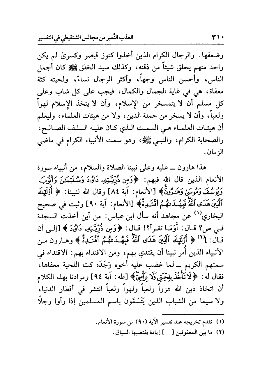 هذا هارون - عليه وعلى نبينا الصلاة والسلام- من أنبياء سورة الأنعام الذين قال الله فيهم: {وَمِن ذُرِّيَّتِهِ دَاوُودَ وَسُلَيْمَانَ وَأَيُّوبَ وَيُوسُفَ وَمُوسَى وَهَارُونَ} [الأنعام: آية ٨٤] وقال الله لنبينا: {أُوْلَئِكَ الَّذِينَ هَدَى الله فَبِهُدَاهُمُ اقْتَدِهْ} [الأنعام: آية ٩٠] وثبت في صحيح البخاري (¬١) عن مجاهد أنه سأل ابن عباس: من أين أخذت السجدة في ص؟ قال: أوَمَا تقرأ؟! قال: {وَمِن ذُرِّيَّتِهِ دَاوُودَ} [إلى أن قال:] (¬٢) {أُوْلَئِكَ الَّذِينَ هَدَى الله فَبِهُدَاهُمُ اقْتَدِهْ} وهارون من الأنبياء الذين أمر نبينا أن يقتدي بهم، ومن الاقتداء بهم: الاقتداء في سمتهم الكريم - لما غضب عليه أخوه وَجَدَه كث اللحية معفاها، فقال له: {لَا تَأْخُذْ بِلِحْيَتِي وَلَا بِرَأْسِي} [طه: آية ٩٤] ومرادنا بهذا الكلام أن اتخاذ دين الله هزواً ولعباً ولهواً ولعباً انتشر في أقطار الدنيا، ولا سيما من الشباب الذين يَتَسَمَّون باسم المسلمين إذا رأوا رجلاً