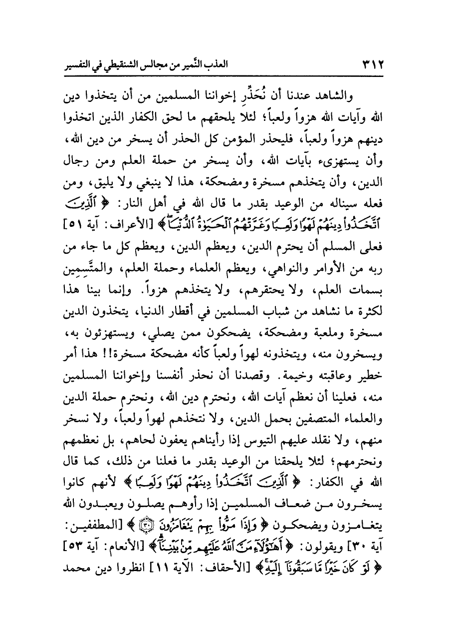 والشاهد عندنا أن نُحَذِّر إخواننا المسلمين من أن يتخذوا دين الله وآيات الله هزواً ولعباً، لئلا يلحقهم ما لحق الكفار الذين اتخذوا دينهم هزواً ولعباً، فليحذر المؤمن كل الحذر أن يسخر من دين الله، وأن يستهزئ بآيات الله، وأن يسخر من حملة العلم ومن رجال الدين، وأن يتخذهم مسخرة ومضحكة، هذا لا ينبغي ولا يليق، ومن فعله سيناله من الوعيد بقدر ما قال الله في أهل النار: {الَّذِينَ اتَّخَذُواْ دِينَهُمْ لَهْواً وَلَعِباً وَغَرَّتْهُمُ الْحَيَاةُ الدُّنْيَا} [الأعراف: آية ٥١] فعلى المسلم أن يحترم الدين، ويعظم الدين، ويعظم كل ما جاء من ربه من الأوامر والنواهي، ويعظم العلماء وحملة العلم، والمتَّسِمِين بسمات العلم، ولا يحتقرهم، ولا يتخذهم هزواً. وإنما بينا هذا لكثرة ما نشاهد من شباب المسلمين في أقطار الدنيا، يتخذون الدين مسخرة وملعبة ومضحكة، يضحكون ممن يصلي، ويستهزئون به، ويسخرون منه، ويتخذونه لهواً ولعباً كأنه مضحكة مسخرة!! هذا أمر خطير وعاقبته وخيمة. وقصدنا أن نحذر أنفسنا وإخواننا المسلمين منه، فعلينا أن نعظم آيات الله، ونحترم دين الله، ونحترم حملة الدين والعلماء المتصفين بحمل الدين، ولا نتخذهم لهواً ولعباً، ولا نسخر منهم، ولا نقلد عليهم التيوس إذا رأيناهم يعفون لحاهم، بل نعظمهم ونحترمهم؛ لئلا يلحقنا من الوعيد بقدر ما فعلنا من ذلك، كما قال الله في الكفار: {الَّذِينَ اتَّخَذُواْ دِينَهُمْ لَهْواً وَلَعِباً} لأنهم كانوا يسخرون من ضعاف المسلمين إذا رأوهم يصلون ويعبدون الله يتغامزون ويضحكون {وَإِذَا مَرُّواْ بِهِمْ يَتَغَامَزُونَ (٣٠)} [المطففين: آية ٣٠] ويقولون: {أَهَؤُلاء مَنَّ الله عَلَيْهِم مِّن بَيْنِنَا} [الأنعام: آية ٥٣] {لَوْ كَانَ خَيْراً مَّا سَبَقُونَا إِلَيْهِ} [الأحقاف: الآية ١١] انظروا دين محمد