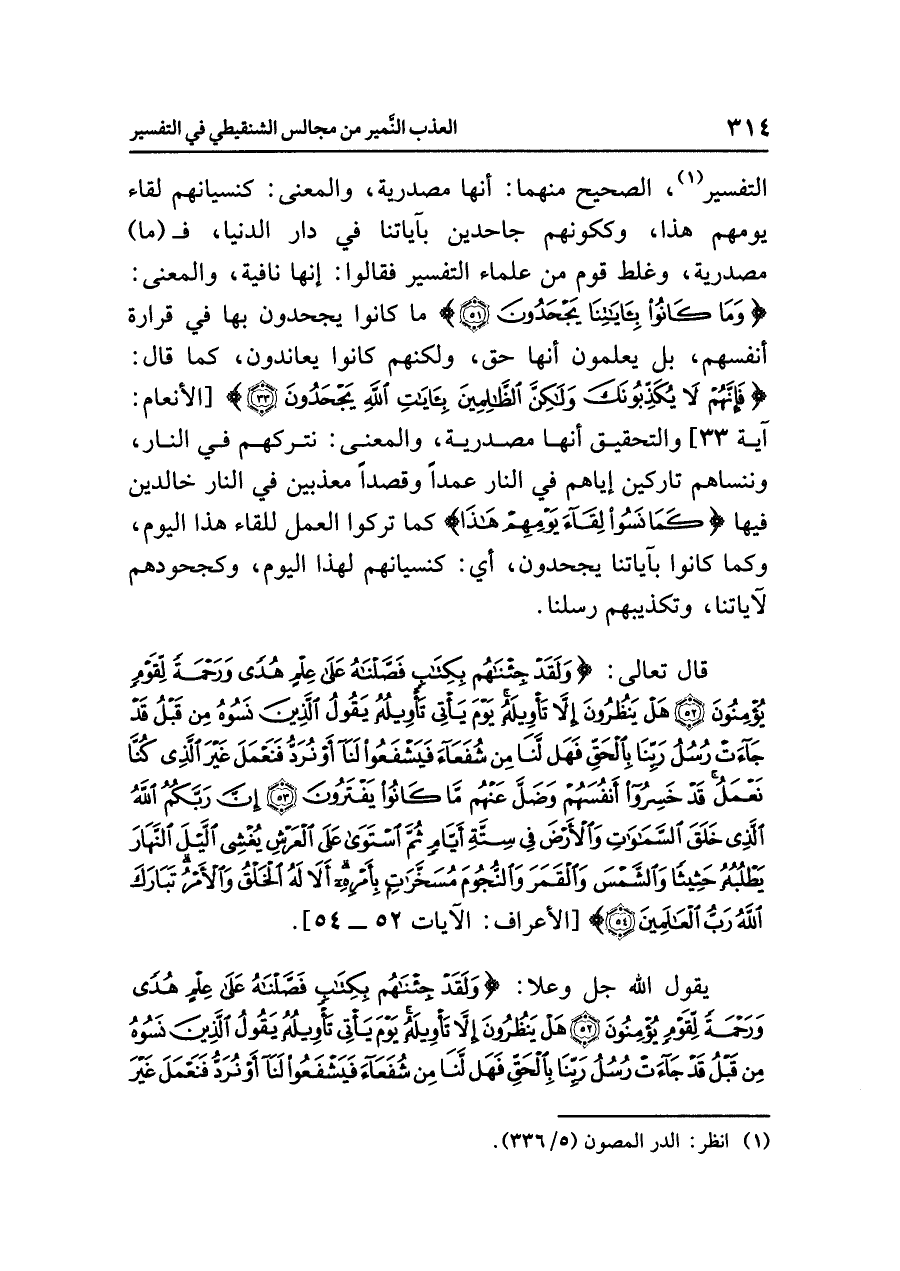 التفسير (¬١)، الصحيح منهما: أنها مصدرية، والمعنى: كنسيانهم لقاء يومهم هذا، وككونهم جاحدين بآياتنا في دار الدنيا، فـ (ما) مصدرية، وغلط قوم من علماء التفسير فقالوا: إنها نافية، والمعنى: {وَمَا كَانُواْ بِآيَاتِنَا يَجْحَدُونَ} ما كانوا يجحدون بها في قرارة أنفسهم، بل يعلمون أنها حق، ولكنهم كانوا يعاندون، كما قال: {فَإِنَّهُمْ لَا يُكَذِّبُونَكَ وَلَكِنَّ الظَّالِمِينَ بِآيَاتِ الله يَجْحَدُونَ} [الأنعام: آية ٣٣] والتحقيق أنها مصدرية، والمعنى: نتركهم في النار، وننساهم تاركين إياهم في النار عمداً وقصداً معذبين في النار خالدين فيها {كَمَا نَسُواْ لِقَاء يَوْمِهِمْ هَذَا} كما تركوا العمل للقاء هذا اليوم، وكما كانوا بآياتنا يجحدون، أي: كنسيانهم لهذا اليوم، وكجحودهم لآياتنا، وتكذيبهم رسلنا.