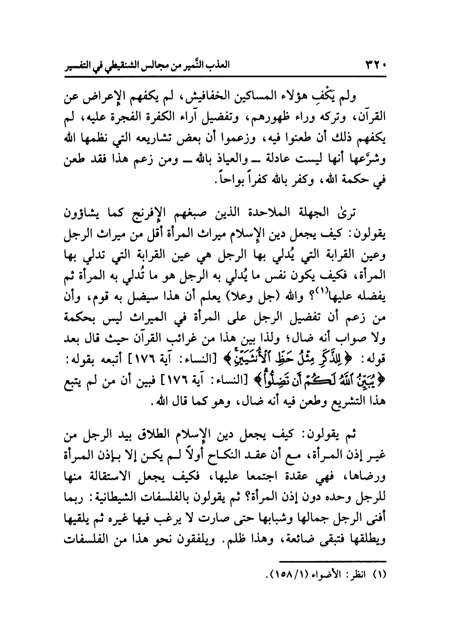 ترى الجهلةَ الملاحدةَ الذين صَبَغَهُمُ الإفرنجُ كما يشاؤون يقولونَ: كيفَ يَجْعَلُ دينُ الإسلامِ ميراثَ المرأةِ أقلَّ من ميراثِ الرجلِ وعينُ القرابةِ التي يُدْلِي بها الرجلُ هي عينُ القرابةِ التي تُدْلِي بها المرأةُ، فكيف يكونُ نَفْسُ ما يُدْلِي به الرجلُ هو ما تُدْلِي به المرأةُ ثم يُفَضِّلُهُ عليها؟ (¬١).