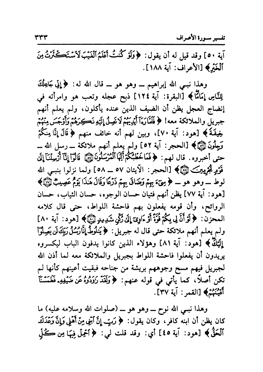 وهذا نَبِيُّ اللَّهِ إبراهيمُ - وَهُوَ هُوَ - قال اللَّهُ له: {إِنِّي جَاعِلُكَ لِلنَّاسِ إِمَامًا} [البقرة: آية ١٢٤] ذَبَحَ عجلَه وَتَعِبَ هو وامرأتُه في إنضاجِ العجلِ يظنُّ أن الضيفَ الذين عنده يأكلونَ، ولم يعلم أنهم جبريلُ والملائكةُ معه! {فَلَمَّا رَأَى أَيْدِيَهُمْ لَا تَصِلُ إِلَيْهِ نَكِرَهُمْ وَأَوْجَسَ مِنْهُمْ خِيفَةً} [هود: آية ٧٠]، وَبَيَّنَ لهم أنه خائفٌ منهم: {قَالَ إِنَّا مِنْكُمْ وَجِلُونَ} [الحجر: آية ٥٢] ولم يعلم أنهم ملائكةٌ - رسلُ اللَّهِ - حتى أخبروه. قال لهم: {قَالَ فَمَا خَطْبُكُمْ أَيُّهَا الْمُرْسَلُونَ (٥٧) قَالُوا إِنَّا أُرْسِلْنَا إِلَى قَوْمٍ مُّجْرِمِينَ (٥٨)} [الحجر: الآيتان ٥٧ - ٥٨] وَلَمَّا نزلوا بنبيِّ اللَّهِ لوطٍ - وهو هو -: {سِيءَ بِهِمْ وَضَاقَ بِهِمْ ذَرْعًا وَقَالَ هَذَا يَوْمٌ عَصِيبٌ} [هود: آية ٧٧] يظن أنهم فتيانٌ حِسَانُ الوجوهِ، حسانُ الثيابِ، حسانُ الروائحِ، وأن قومَه يفعلونَ بهم فاحشةَ اللواطِ، حتى قال كلامَه المحزنَ: {لَوْ أَنَّ لِي بِكُمْ قُوَّةً أَوْ آوِي إِلَى رُكْنٍ شَدِيدٍ} [هود: آية ٨٠] ولم يعلم أنهم ملائكةٌ حتى قال له جبريلُ: {يَا لُوطُ إِنَّا رُسُلُ رَبِّكَ لَنْ يَصِلُوا إِلَيْكَ} [هود: آية ٨١] وهؤلاء الذين كانوا يدفعونَ البابَ ليكسروه يريدونَ أن يفعلوا فاحشةَ اللواطِ بجبريلَ والملائكةِ معه لَمَّا أَذِنَ اللَّهُ لجبريلَ فيهم مَسَحَ وجوهَهم بريشةٍ من جناحِه فبقيت أعينُهم كأنها لم تكن أصلاً، كما يأتي في قولِه عنهم: {وَلَقَدْ رَاوَدُوهُ عَنْ ضَيْفِهِ فَطَمَسْنَا أَعْيُنَهُمْ} [القمر: آية ٣٧].
