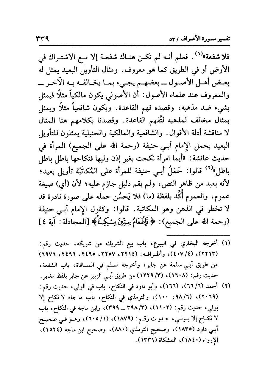 والشافعيةُ والمالكيةُ والحنبليةُ يمثلونَ للتأويلِ البعيدِ بِحَمْلِ الإمامِ أَبِي حنيفةَ (رحمة الله على الجميعِ) المرأةَ في حديثِ عائشةَ: «أَيُّمَا امْرَأَةٍ نَكَحَتْ بِغَيْرِ إِذْنِ وَلِيِّهَا فَنِكَاحُهَا بَاطِلٌ بَاطِلٌ بَاطِلٌ» (¬٢) قالوا: حَمْلُ أَبِي حنيفةَ للمرأةِ على المُكاتَبَةِ تأويلٌ بعيدٌ؛ لأنه بعيدٌ من ظاهرِ النصِّ، ولم يَقُمْ دليلٌ جازمٌ عليه؛ لأن (أي) صيغةُ عمومٍ، والعمومُ أُكِّدَ بلفظةِ (ما) فَلَا يَحْسُنُ حَمْلُهُ على صورةٍ نادرةٍ قد لا تَخْطُرُ في الذهنِ وهو الْمُكَاتَبَةُ. قالوا: وكقولِ الإمامِ أَبِي حنيفةَ (رحمة الله على الجميعِ): {فَإِطْعَامُ سِتِّينَ مِسْكِينًا} [المجادلة: آية ٤]