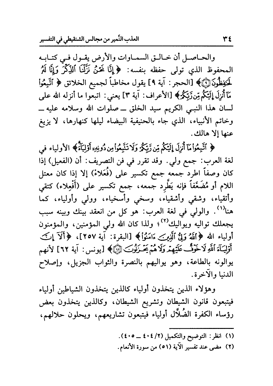{اتَّبِعُواْ مَا أُنزِلَ إِلَيْكُم مِّن رَّبِّكُمْ وَلَا تَتَّبِعُواْ مِن دُونِهِ أَوْلِيَاء} الأولياء في لغة العرب: جمع ولي، وقد تقرر في فن التصريف: أن (الفعيل) إذا كان وصفاً اطرد جمعه جمع تكسير على (فُعَلاءْ) إلا إذا كان معتل اللام أو مُضَعَّفاً فإنه يَطَّرِد جمعه جمع تكسير على (أَفْعِلاء) كتقي وأتقياء، وشقي وأشقياء، وسخي وأسخياء، وولي وأولياء، كما هنا (¬١). والولي في لغة العرب: هو كل مَنِ انْعَقَدَ بَيْنَك وبَيْنَهُ سَبَبٌ يجعلك تواليه ويواليك (¬٢)؛ ولذا كان الله ولي المؤمنين، والمؤمنون أولياء الله {الله وَلِيُّ الَّذِينَ آمَنُواْ} [البقرة: آية ٢٥٧] {أَلا إِنَّ أَوْلِيَاء الله لَا خَوْفٌ عَلَيْهِمْ وَلَا هُمْ يَحْزَنُونَ (٦٢)} [يونس: آية ٦٢] لأنهم يوالونه بالطاعة، وهو يواليهم بالنصرة والثواب الجزيل، وإصلاح الدنيا والآخرة.