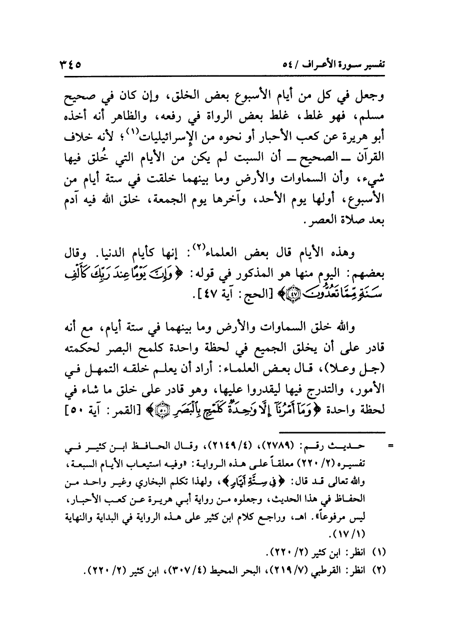 وجعلَ في كُلٍّ من أيامِ الأسبوعِ بعضَ الخلقِ، وإن كان في صحيحِ مسلمٍ فهو غَلَطٌ، غَلِطَ بعضُ الرواةِ في رَفْعِهِ، والظاهرُ أنه أَخَذَهُ أبو هريرةَ عن كعبِ الأحبارِ أو نحوِه من الإسرائيلياتِ (¬١)؛ لأنه خلافُ القرآنِ - الصحيحُ - أن السبتَ لم يكن من الأيامِ التي خُلِقَ فيها شيءٌ، وأن السماواتِ والأرضَ وما بينَهما خُلِقَتْ في ستةِ أيامٍ من الأسبوعِ، أولها يومُ الأحدِ، وآخرُها يومُ الجمعةِ، خَلَقَ اللَّهُ فيه آدمَ بعدَ صلاةِ العصرِ.