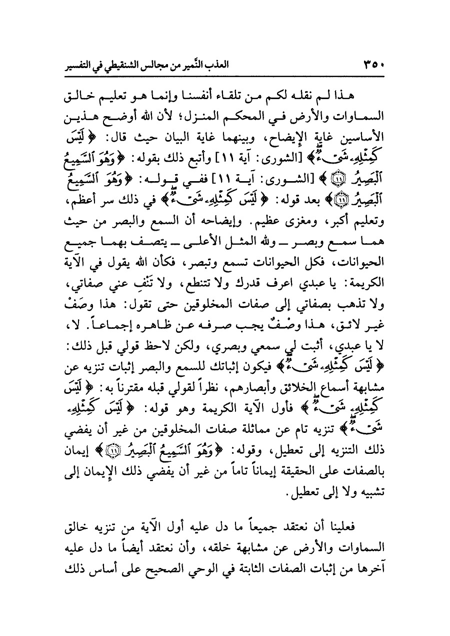 هذا لم نَقُلْهُ لكم من تلقاءِ أنفسِنا وإنما هو تعليمُ خالقِ السماواتِ والأرضِ في المحكمِ المنزلِ؛ لأَنَّ اللَّهَ أَوْضَحَ هذين الأَسَاسَيْنِ غايةَ الإيضاحِ، وَبَيَّنَهُمَا غايةَ البيانِ حيث قال: {لَيْسَ كَمِثْلِهِ شَيْءٌ} [الشورى: آية ١١] وأتبع ذلك بقولِه: {وَهُوَ السَّمِيعُ البَصِيرُ} [الشورى: آية ١١] ففي قولِه: {وَهُوَ السَّمِيعُ البَصِيرُ} بعد قولِه: {لَيْسَ كَمِثْلِهِ شَيْءٌ} في ذلك سِرٌّ أعظمُ، وتعليمٌ أكبرُ، ومغزًى عظيمٌ. وإيضاحُه أن السمعَ والبصرَ من حيث هما سَمْعٌ وبصرٌ - وَلِلَّهِ الْمَثَلُ الأَعْلَى - يتصفُ بهما جميعُ الحيواناتِ، فكلُّ الحيواناتِ تسمعُ وَتُبْصِرُ، فَكَأَنَّ اللَّهَ يقولُ في الآيةِ الكريمةِ: يا عبدي اعْرِفْ قَدْرَكَ ولَا تَتَنَطَّعْ، ولا تَنْفِ عَنِّي صفاتي، ولا تَذْهَبْ بصفاتِي إلى صفاتِ المخلوقين حتى تقولَ: هذا وصَفٌ غيرُ لائقٍ، هذا وصفٌ يجبُ صَرْفُهُ عن ظاهرِه إجماعًا. لا، لا يا عبدي، أَثْبِتْ لي سمعي وبصري، ولكن لَاحِظْ قولي قبلَ ذلك: {لَيْسَ كَمِثْلِهِ شَيْءٌ} فيكونُ إِثْبَاتُكَ للسمعِ والبصرِ إثباتَ تنزيهٍ عن مشابهةِ أسماعِ الخلائقِ وأبصارِهم، نَظَرًا لقولي قبلَه مقترنًا به: {لَيْسَ كَمِثْلِهِ شَيْءٌ} فأولُ الآيةِ الكريمةِ وهو قولُه: {لَيْسَ كَمِثْلِهِ شَيْءٌ} تنزيهٌ تَامٌّ عن مماثلةِ صفاتِ المخلوقين من غيرِ أن يفضيَ ذلك التنزيهُ إلى تعطيلٍ.