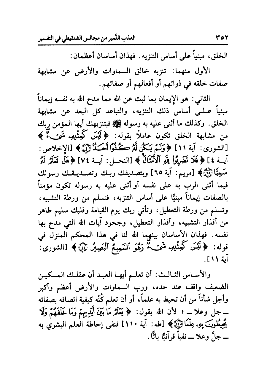 الثاني: هو الإيمانُ بما ثَبَتَ عن اللَّهِ مما مَدَحَ اللَّهُ به نفسَه إيمانًا مَبْنِيًّا على أساسِ ذلك التنزيهِ، والتباعدِ كُلَّ البعدِ عن مشابهةِ الخلقِ. وكذلك ما أَثْبَتَهُ عليه به رسولُه صلى الله عليه وسلم فبتنزيهك أيها المؤمنُ رَبَّكَ من مشابهةِ الخلقِ تكونُ عَامِلاً بقولِه: {لَيْسَ كَمِثْلِهِ شَيْءٌ} [الشورى: آية ١١] {وَلَمْ يَكُن لَّهُ كُفُوًا أَحَدٌ (٤)} [الإخلاص: آية ٤] {فَلَا تَضْرِبُوا لِلَّهِ الأَمْثَالَ} [النحل: آية ٧٤] {هَلْ تَعْلَمُ لَهُ سَمِيًّا} [مريم: آية ٦] وَبِتَصْدِيقِكَ رَبَّكَ وتصديقِك رسولَك فيما أَثْنَى الربُّ به على نفسِه أو أثنى عليه به رسولُه تكونُ مُؤْمِنًا بالصفاتِ إيمانًا مَبْنِيًّا على أساسِ التنزيهِ، فتسلمُ من ورطةِ التشبيهِ، وتسلمُ من ورطةِ التعطيلِ، وتأتي رَبَّكَ يومَ القيامةِ وقلبُك سليمٌ طاهرٌ من أقذارِ التشبيهِ، وأقذارِ التعطيلِ، وجحودِ آياتِ اللَّهِ التي مَدَحَ بها نَفْسَهُ. فهذانِ الأساسانِ بَيَّنَهُمَا اللَّهُ لنا في هذا الْمُحْكَمِ الْمُنَزَّلِ في قولِه: {لَيْسَ كَمِثْلِهِ شَيْءٌ وَهُوَ السَّمِيعُ البَصِيرُ} [الشورى: آية ١١].