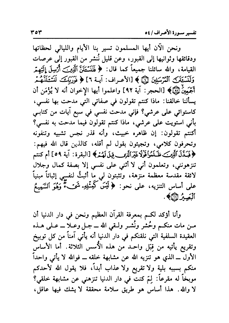 ونحن الآنَ أيها المسلمونَ تسيرُ بنا الأيامُ والليالي لحظاتُها ودقائقُها وثوانيها إلى القبورِ، وعن قليلٍ نُنْشَرُ من القبورِ إلى عرصاتِ القيامةِ، وَاللَّهُ سَائِلُنَا جميعًا كما قال: {فَلَنَسْأَلَنَّ الَّذِينَ أُرْسِلَ إِلَيْهِمْ وَلَنَسْأَلَنَّ الْمُرْسَلِينَ (٦)} [الأعراف: آية ٦] {فَوَرَبِّكَ لَنَسْأَلَنَّهُمْ أَجْمَعِيْنَ (٩٢)} [الحجر: آية ٩٢] واعلموا أيها الإخوانُ أنه لا يُؤْمَنُ أن يسألَنا خالقُنا: ماذا كُنْتُمْ تقولونَ في صفاتِي التي مَدَحْتُ بها نَفْسِي، كاستوائِي على عَرْشِي؟ فإني مدحتُ نفسي في سبعِ آياتٍ من كتابِي بأني استويتُ على عَرْشِي، ماذا كنتُم تقولونَ فيما مدحتُ به نفسي؟ كنتُم تقولونَ: إن ظاهرَه خبيثٌ، وأنه قذرٌ نَجِسٌ تشبيهٌ وتنفونَه وتحرفونَ كلامي، تجيئون بقولٍ لَمْ أَقُلْهُ، كالذين قال اللَّهُ فيهم: {فَبَدَّلَ الَّذِينَ ظَلَمُوا قَوْلاً غَيْرَ الَّذِي قِيلَ لَهُمْ} [البقرة: آية ٥٩] أَمْ كنتُم تُنَزِّهُونَنِي، وتعلمونَ أني لا أُثْنِي على نفسِي إلا بصفةِ كمالٍ وجلالٍ لائقةٍ مقدسةٍ معظمةٍ منزهة، وتثبتونَ لِي ما أَثْبَتُّ لنفسي إثباتًا مَبْنِيًّا على أساسِ التنزيهِ، على نحوِ: {لَيْسَ كَمِثْلِهِ شَيْءٌ وَهُوَ السَّمِيعُ البَصِيرُ}.