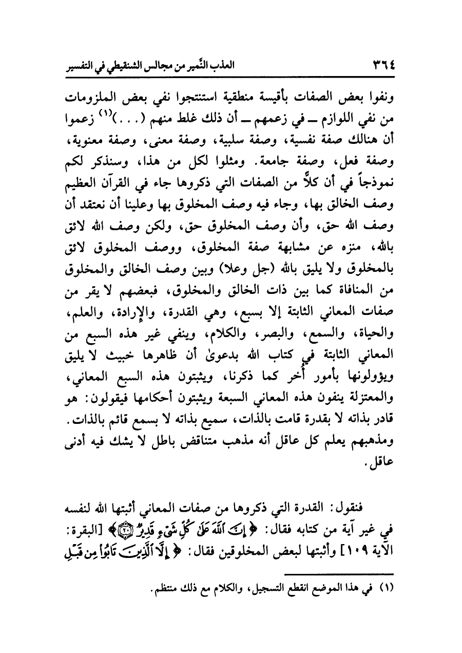 فنقولُ: القدرةُ التي ذَكَرُوهَا من صفاتِ المعانِي أَثْبَتَهَا اللَّهُ لنفسِه في غيرِ آيةٍ من كتابِه فقالَ: {إِنَّ اللَّهَ عَلَى كُلِّ شَيْءٍ قَدِيرٌ} [البقرة: الآية ١٠٩] وأثبتَها لبعضِ المخلوقين فقال: {إِلَاّ الَّذِينَ تَابُوا مِنْ قَبْلِ