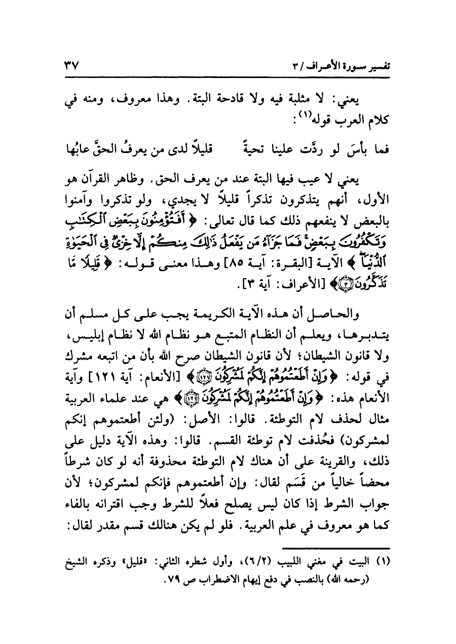 يعني لا عيب فيها البتة عِنْدَ مَنْ يَعْرِف الحق، وظاهر القرآن هو الأول، أنهم يتذكرون تذكُّراً قليلاً لا يُجْدِي، ولو تذكروا وآمنوا بالبعض لا ينفعهم ذلك كما قال تعالى: {أَفَتُؤْمِنُونَ بِبَعْضِ الْكِتَابِ وَتَكْفُرُونَ بِبَعْضٍ فَمَا جَزَاءُ مَن يَفْعَلُ ذَلِكَ مِنكُمْ إِلَاّ خِزْيٌ فِي الْحَيَاةِ الدُّنْيَا} الآية [البقرة: آية ٨٥] وهذا معنى قوله: {قَلِيلاً مَّا تَذَكَّرُونَ} [الأعراف: آية ٣].