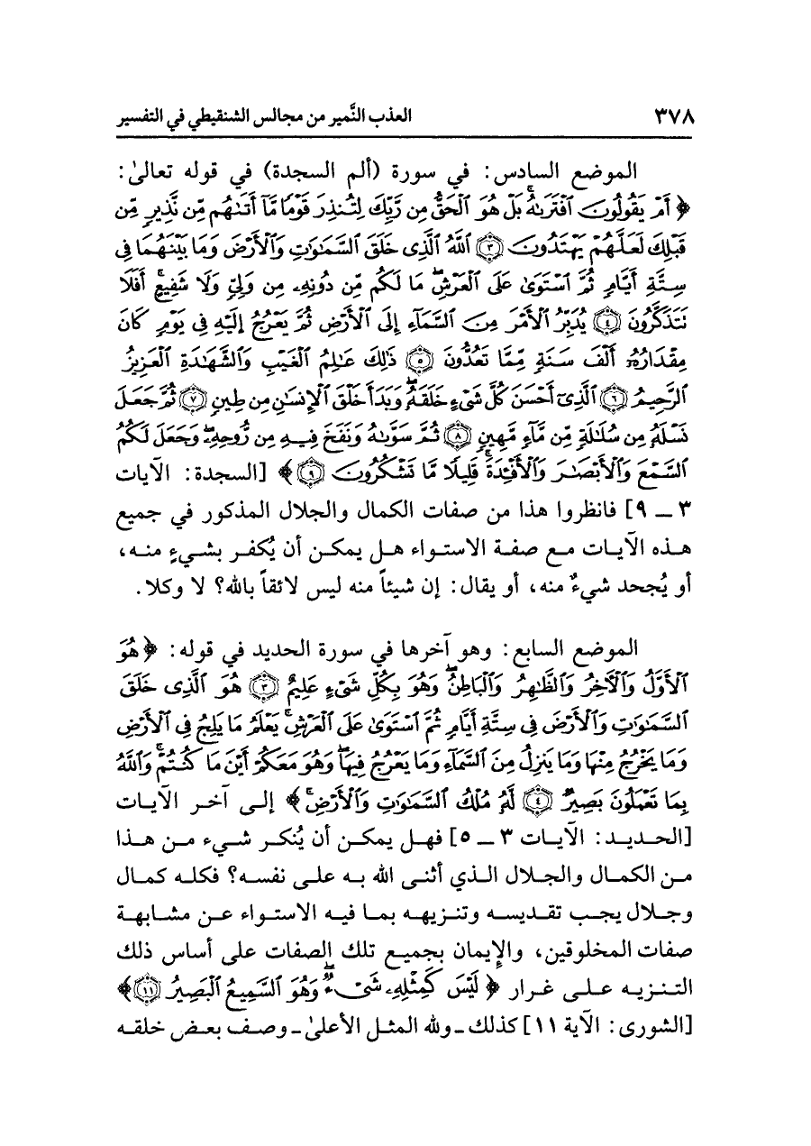 الموضعُ السادسُ: في سورةِ (ألم السجدة) في قولِه تعالى: {أَمْ يَقُولُونَ افْتَرَاهُ بَلْ هُوَ الْحَقُّ مِن رَّبِّكَ لِتُنْذِرَ قَوْمًا مَّا أَتَاهُم مِّن نَّذِيرٍ مِّنْ قَبْلِكَ لَعَلَّهُمْ يَهْتَدُونَ (٣) اللَّهُ الَّذِي خَلَقَ السَّمَاوَاتِ وَالْأَرْضَ وَمَا بَيْنَهُمَا فِي سِتَّةِ أَيَّامٍ ثُمَّ اسْتَوَى عَلَى الْعَرْشِ مَا لَكُم مِّنْ دُونِهِ مِنْ وَلِيٍّ وَلَا شَفِيعٍ أَفَلَا تَتَذَكَّرُونَ (٤) يُدَبِّرُ الْأَمْرَ مِنَ السَّمَاءِ إِلَى الْأَرْضِ ثُمَّ يَعْرُجُ إِلَيْهِ فِي يَوْمٍ كَانَ مِقْدَارُهُ أَلْفَ سَنَةٍ مِّمَّا تَعُدُّونَ (٥) ذَلِكَ عَالِمُ الْغَيْبِ وَالشَّهَادَةِ الْعَزِيزُ الرَّحِيمُ (٦) الَّذِي أَحْسَنَ كُلَّ شَيْءٍ خَلَقَهُ وَبَدَأَ خَلْقَ الْإِنسَانِ مِنْ طِينٍ (٧) ثُمَّ جَعَلَ نَسْلَهُ مِنْ سُلَالَةٍ مِّن مَّاءٍ مَّهِينٍ (٨) ثُمَّ سَوَّاهُ وَنَفَخَ فِيهِ مِن رُّوحِهِ وَجَعَلَ لَكُمُ السَّمْعَ وَالْأَبْصَارَ وَالْأَفْئِدَةَ قَلِيلاً مَّا تَشْكُرُونَ (٩)} [السجدة: الآيات ٣ - ٩] فانظروا هذا من صفاتِ الكمالِ والجلالِ المذكورِ في جميعِ هذه الآياتِ مع صفةِ الاستواءِ هل يمكنُ أن يُكْفَرَ بشيءٍ منه، أو يُجْحَدَ شيءٌ منه، أو يقال: إن شيئًا منه ليس لَائِقًا بالله؟ لَا وَكَلَاّ.