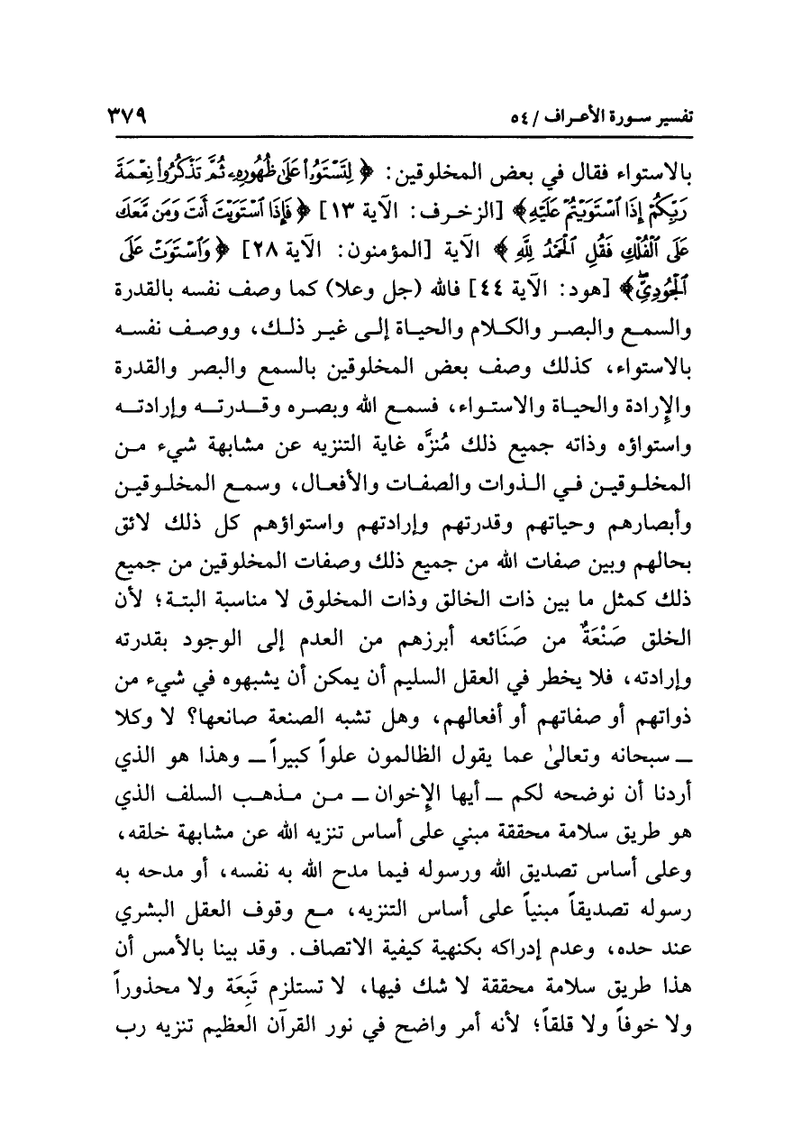 بالاستواءِ فقال في بعضِ المخلوقين: {لِتَسْتَوُوا عَلَى ظُهُورِهِ ثُمَّ تَذْكُرُوا نِعْمَةَ رَبِّكُمْ إِذَا اسْتَوَيْتُمْ عَلَيْهِ} [الزخرف: الآية ١٣] {فَإِذَا اسْتَوَيْتَ أَنْتَ وَمَن مَّعَكَ عَلَى الْفُلْكِ فَقُلِ الْحَمْدُ لِلَّهِ} الآية [النحل: الآية ٢٨] {وَاسْتَوَتْ عَلَى الْجُودِيِّ} [هود: الآية ٤٤] فَاللَّهُ (جل وعلا) كما وَصَفَ نفسَه بالقدرةِ والسمعِ والبصرِ والكلامِ والحياةِ إلى غيرِ ذلك، وَوَصَفَ نفسَه بالاستواءِ، كذلك وَصَفَ بعضَ المخلوقين بالسمعِ والبصرِ والقدرةِ والإرادةِ والحياةِ والاستواءِ، فَسَمْعُ اللَّهِ وبصرُه وقدرتُه وإرادتُه واستواؤُه وذاتُه جميعُ ذلك مُنزَّهٌ غايةَ التنزيهِ عن مشابهةِ شيءٍ من المخلوقين في الذواتِ والصفاتِ والأفعالِ، وَسَمْعُ المخلوقينَ وأبصارُهم وحياتُهم وقدرتُهم وإرادتُهم واستواؤهم كُلُّ ذلك لائقٌ بحالهم وبينَ صفاتِ اللَّهِ من جميعِ ذلك وصفاتِ المخلوقين من جميعِ ذلك كمثلِ ما بينَ ذاتِ الخالقِ وذاتِ المخلوقِ لَا مناسبةَ ألبتةَ؛ لأن الخلقَ صَنْعَةٌ من صَنَائعِه