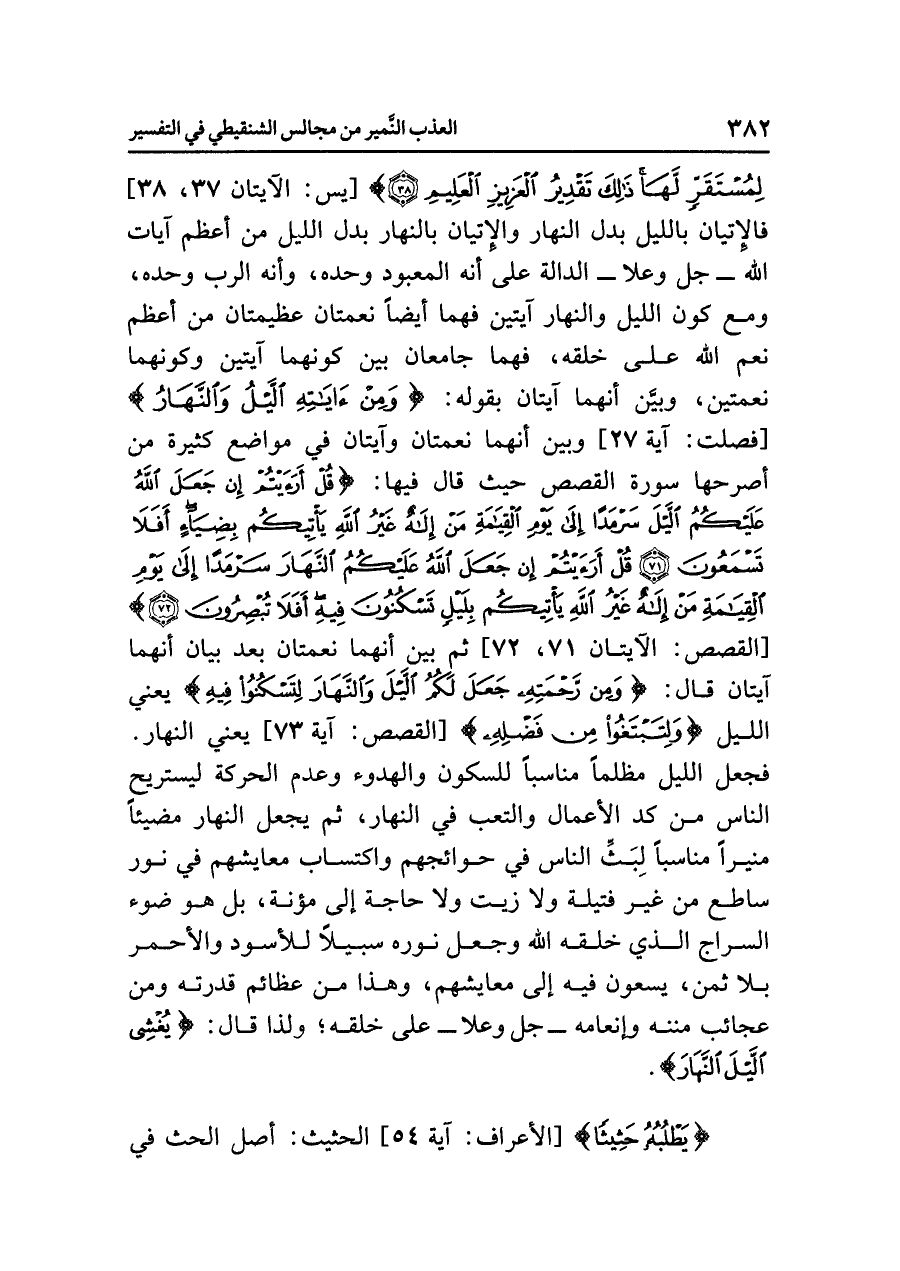 لِمُسْتَقَرٍّ لَّهَا ذَلِكَ تَقْدِيرُ الْعَزِيزِ الْعَلِيمِ (٣٨)} [يس: الآيتان ٣٧، ٣٨] فالإتيانُ بالليلِ بدلَ النهارِ والإتيانُ بالنهارِ بدلَ الليلِ من أعظمِ آياتِ اللَّهِ - جل وعلا - الدالة على أنه المعبودُ وحدَه، وأنه الربُّ وحدَه، ومع كونِ الليلِ والنهارِ آيتين فَهُمَا أيضًا نعمتانِ عظيمتانِ من أعظمِ نِعَمِ اللَّهِ على خَلْقِهِ، فهما جامعانِ بينَ كونِهما آيتين وكونهما نعمتين، وَبيَّنَ أنهما آيتانِ بقولِه: {وَمِنْ آيَاتِهِ اللَّيْلُ وَالنَّهَارُ} [فصلت: آية ٢٧] وَبَيَّنَ أنهما نعمتانِ وآيتانِ في مواضعَ كثيرةٍ من أصرحِها سورةُ القصصِ حيث قال فيها: {قُلْ أَرَأَيْتُمْ إِنْ جَعَلَ اللَّهُ عَلَيْكُمُ اللَّيْلَ سَرْمَدًا إِلَى يَوْمِ الْقِيَامَةِ مَنْ إِلَهٌ غَيْرُ اللَّهِ يَأْتِيكُمْ بِضِيَاءٍ أَفَلَا تَسْمَعُونَ (٧١) قُلْ أَرَأَيْتُمْ إِنْ جَعَلَ اللَّهُ عَلَيْكُمُ النَّهَارَ سَرْمَدًا إِلَى يَوْمِ الْقِيَامَةِ مَنْ إِلَهٌ غَيْرُ اللَّهِ يَأْتِيكُم بِلَيْلٍ تَسْكُنُونَ فِيهِ أَفَلَا تُبْصِرُونَ (٧٢)} [القصص: الآيتان ٧١، ٧٢] ثم بَيَّنَ أنهما نعمتانِ بعدَ بيانِ أنهما آيتانِ قال: {وَمِن رَّحْمَتِهِ جَعَلَ لَكُمُ اللَّيْلَ وَالنَّهَارَ لِتَسْكُنُوا فِيهِ} [القصص: آية ٧٣] يعنِي النهار.