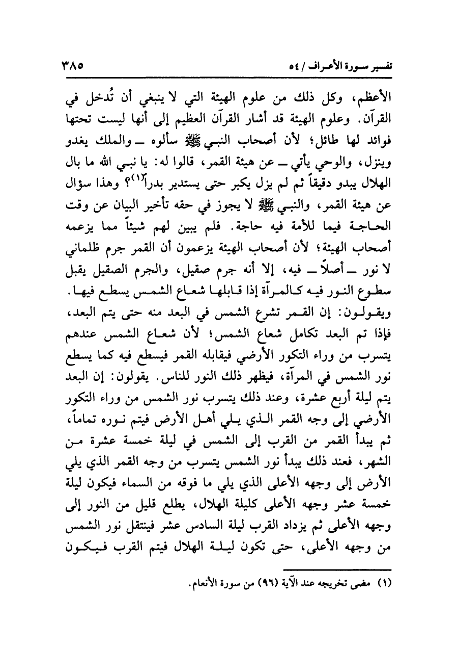 الأعظمِ، وَكُلُّ ذلك من علومِ الهيئةِ التي لا ينبغي أن تُدْخَلَ في القرآنِ. وعلومُ الهيئةِ قد أشارَ القرآنُ العظيمُ إلى أنها ليست تحتَها فوائدُ لها طائلٌ؛ لأن أصحابَ النبيِّ صلى الله عليه وسلم سألوه - وَالْمَلَكُ يَغْدُو وينزلُ، والوحيُ يأتي - عن هيئةِ القمرِ، قالوا له: يا نَبِيَّ اللَّهِ ما بالُ الهلالِ يبدو دقيقًا ثم لم يَزَلْ يكبرُ حتى يستديرَ بَدْرًا (¬١)؟ وهذا سؤالٌ عن هيئةِ القمرِ، والنبيُّ صلى الله عليه وسلم لا يجوزُ في حقِّه تأخيرُ البيانِ عن وقتِ الحاجةِ فيما للأمةِ فيه حاجةٌ. فلم يُبَيِّنْ لهم شيئًا مما يَزْعُمُهُ أصحابُ الهيئة؛ لأن أصحابَ الهيئةِ يزعمونَ أن القمرَ جرمٌ ظلمانيٌّ لا نورَ - أصلاً - فيه، إلا أنه جرمٌ صقيلٌ، والجرمُ الصقيلُ يقبل سطوعَ النورِ فيه كالمرآةِ إذا قَابَلَهَا شعاعُ الشمسِ يسطعُ فيها. ويقولون: إن القمرَ تشرعُ الشمسُ في البعدِ منه حتى يتمَّ البعدُ، فإذا تم البعدُ تَكَامَلَ شعاعُ الشمسِ؛ لأن شعاعَ الشمسِ عندهم يتسربُ من وراءِ التكورِ الأرضيِّ فيقابلُه القمرُ فيسطعُ فيه كما يسطعُ نورُ الشمسِ في المرآةِ، فيظهرُ ذلك النورُ للناسِ.