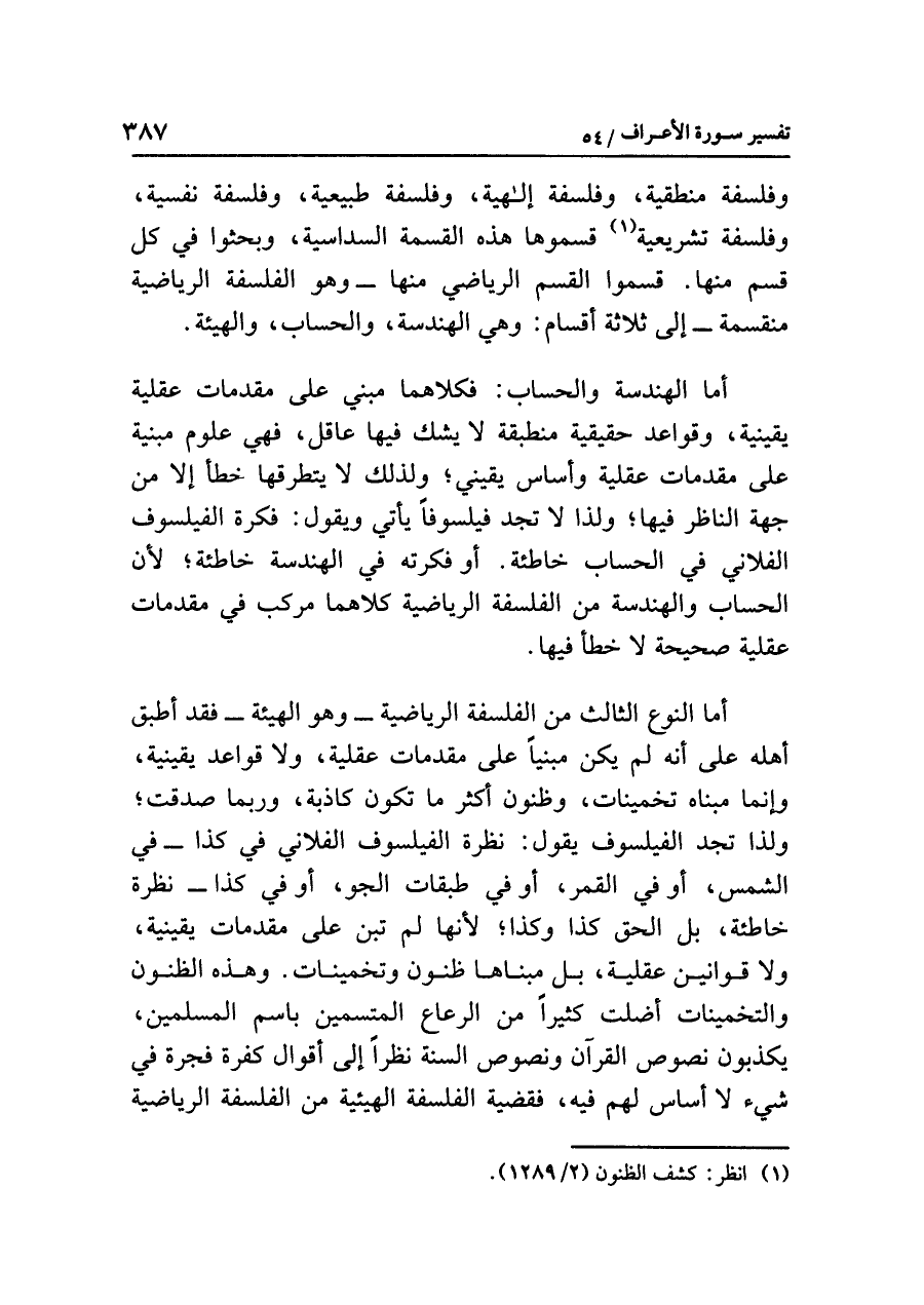 أما النوعُ الثالثُ من الفلسفةِ الرياضيةِ - وهو الهيئةُ - فقد أَطْبَقَ أهلُه على أنه لم يكن مَبْنِيًّا على مقدماتٍ عقليةٍ، ولا قواعدَ يقينيةٍ، وإنما مَبْنَاهُ تخميناتٌ، وظنونٌ أكثرُ ما تكونُ كاذبةً، وربما صَدَقَتْ؛ ولذا تجدُ الفيلسوفَ يقولُ: نظرةُ الفيلسوفِ الفلانيِّ في كذا - في الشمسِ، أو في القمرِ، أو في طبقاتِ الجوِّ، أو في كذا - نظرةٌ خاطئةٌ، بل الحقُّ كذا وكذا؛ لأنها لم تُبْنَ على مقدماتٍ يقينيةٍ، ولا قوانينَ عقليةٍ، بل مَبْنَاهَا ظنونٌ وتخميناتٌ. وهذه الظنونُ والتخميناتُ أَضَلَّتْ كثيرًا من الرعاعِ الْمُتَسَمِّينَ باسمِ المسلمين، يُكَذِّبُونَ نصوصَ القرآنِ ونصوصَ السنةِ نَظَرًا إلى أقوالِ كفرةٍ فجرةٍ في شيءٍ لَا أساسَ لهم فيه، فقضيةُ الفلسفةِ الهيئيةِ من الفلسفةِ الرياضيةِ