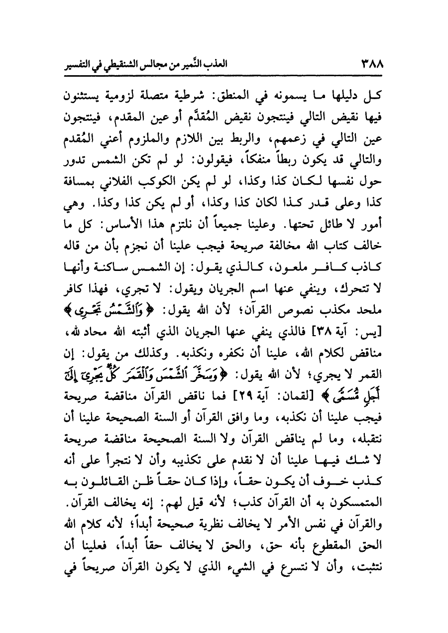 وعلينا جميعًا أن نلتزمَ هذا الأساسَ: كُلُّ ما خَالَفَ كتابَ اللَّهِ مخالفةً صريحةً فيجبُ علينا أن نجزمَ بأن مَنْ قَالَهُ كاذبٌ كافرٌ ملعونٌ، كالذي يقولُ: إن الشمسَ ساكنةٌ وأنها لا تتحركُ، وينفِي عنها اسمَ الجريانِ ويقولُ: لا تَجْرِي، فهذا كافرٌ ملحدٌ مُكَذِّبٌ نصوصَ القرآنِ؛ لأَنَّ اللَّهَ يقولُ: {وَالشَّمْسُ تَجْرِي} [يس: آية ٣٨] فالذي ينفِي عنها الجريانَ الذي أَثْبَتَهُ اللَّهُ مُحَادٌّ لِلَّهِ، مناقضٌ لكلامِ اللَّهِ، علينا أن نُكَفِّرَهُ ونكذبه. وكذلك مَنْ يقولُ: إن القمرَ لَا يجري؛ لأَنَّ اللَّهَ يقولُ: {وَسَخَّرَ الشَّمْسَ وَالْقَمَرَ كُلٌّ يَجْرِي إِلَى أَجَلٍ مُّسَمًّى} [لقمان: آية ٢٩] فَمَا نَاقَضَ القرآنَ مناقضةً صريحةً فيجبُ علينا أن نكذبَه، وما وافقَ القرآنَ أو السُّنَّةَ الصحيحةَ علينا أن نتقبلَه، وما لم يناقض القرآنَ ولا السنةَ الصحيحةَ مناقضةً صريحةً فيجبُ علينا أن لَا نقدمَ على تكذيبِه وأن لا نتجرأَ على أنه كَذِبٌ خَوْفَ أن يكونَ حَقًّا، وإذا كان حَقًّا ظَنَّ القائلونَ به المتمسكونَ به أن القرآنَ كَذِبٌ؛ لأنه قيل لهم: إنه يخالفُ القرآنَ. والقرآنُ في نفسِ الأمرِ لا يخالفُ نظريةً صحيحةً أبدًا؛ لأنه كلامُ اللَّهِ الحقُّ المقطوعُ بأنه حَقٌّ، والحقُّ لا يُخَالِفُ حَقًّا أبدًا، فعلينا أن نَتَثَبَّتَ، وأن لَا نتسرعَ في الشيءِ الذي لا يكونُ القرآنُ صريحًا في