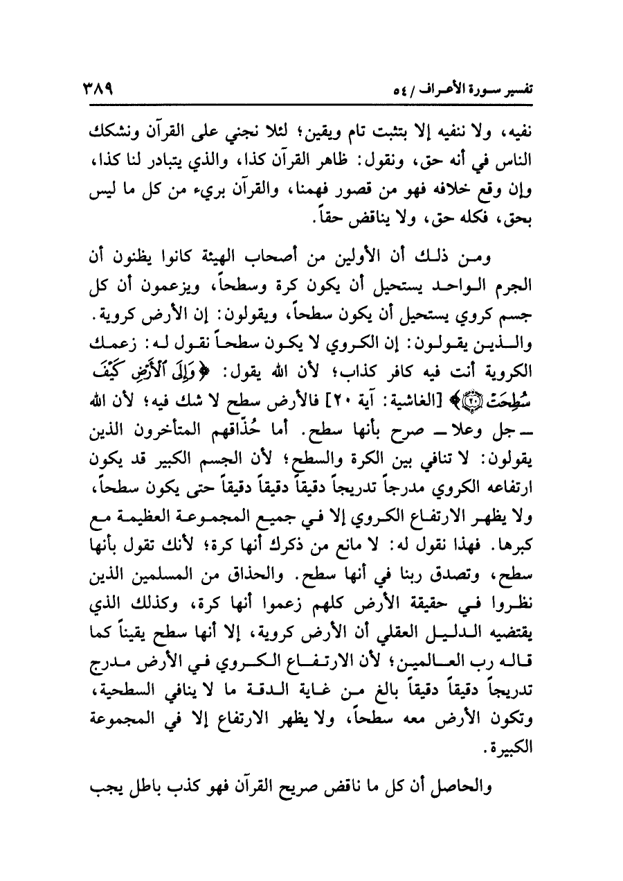 ومن ذلك أن الأولين من أصحابِ الهيئةِ كانوا يظنونَ أن الجرمَ الواحدَ يستحيلُ أن يكونَ كُرَةً وَسَطْحًا، ويزعمونَ أن كُلَّ جسمٍ كرويٍّ يستحيلُ أن يكونَ سَطْحًا، ويقولونَ: إن الأرضَ كرويةٌ. والذين يقولونَ: إن الكرويَّ لَا يكونُ سَطْحًا نقولُ له: زعمُك الكرويةَ أنتَ فيه كافرٌ كَذَّابٌ؛ لأَنَّ اللَّهَ يقولُ: {وَإِلَى الْأَرْضِ كَيْفَ سُطِحَتْ (٢٠)} [الغاشية: آية ٢٠] فالأرضُ سطحٌ لَا شَكَّ فيه؛ لأن الله - جل وعلا - صَرَّحَ بأنها سَطْحٌ. أما حُذَّاقُهُمُ المتأخرونَ الذين يقولونَ: لَا تَنَافِيَ بينَ الكرةِ والسطحِ؛ لأن الجسمَ الكبيرَ قد يكونُ ارتفاعُه الكرويُّ مُدَرَّجًا تدريجًا دقيقًا دقيقًا دقيقًا حتى يكونَ سطحًا، ولا يظهرُ الارتفاعُ الكرويُّ إلا في جميعِ المجموعةِ العظيمةِ مع كِبَرِهَا. فهذا نقولُ له: لا مانعَ من ذِكْرِكَ أنها كرةٌ؛ لأنك تقولُ بأنها سطحٌ، وَتُصَدِّقُ رَبَّنَا في أنها سطحٌ. والحذاقُ من المسلمين الذين نَظَرُوا في حقيقةِ الأرضِ كُلُّهُمْ زعموا أنها كرةٌ، وكذلك الذي يَقْتَضِيهِ الدليلُ العقليُّ أن الأرضَ كرويةٌ، إلا أنها سطحٌ يَقِينًا كما قاله رَبُّ العالمين؛ لأن الارتفاعَ الكرويَّ في الأرضِ مدرجٌ تدريجًا دقيقًا دقيقًا بَالِغٌ من غايةِ الدقةِ ما لا يُنَافِي السطحيةَ، وتكونُ الأرضُ معه سَطْحًا، ولا يظهرُ الارتفاعُ إلا في المجموعةِ الكبيرةِ.