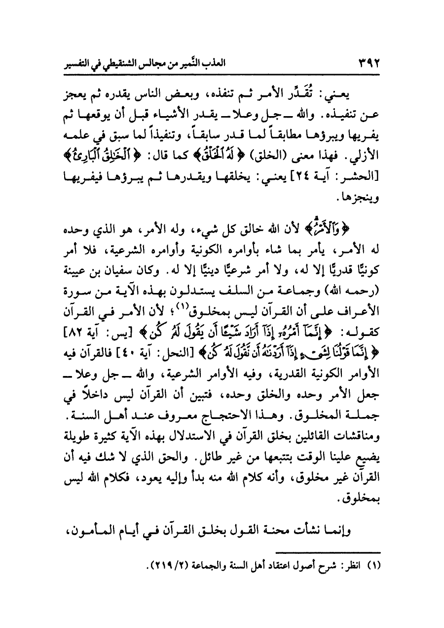 {وَالأَمْرُ} لأَنَّ اللَّهَ خالقُ كُلِّ شيءٍ، وله الأمرُ، هو الذي وحدَه له الأمرُ، يأمر بما شاءَ بأوامرِه الكونيةِ وأوامرِه الشرعيةِ، فلَا أَمْرَ كونيًّا قدريًّا إلا له، ولا أمر شرعيًّا دينيًّا إلا له. وكان سفيانُ بنُ عيينةَ (رحمه الله) وجماعةٌ من السلفِ يستدلونَ بهذه الآيةِ من سورةِ الأعرافِ على أن القرآنَ ليس بمخلوقٍ (¬١)؛ لأن الأمرَ في القرآنِ كقولِه: {إِنَّمَا أَمْرُهُ إِذَا أَرَادَ شَيْئًا أَنْ يَقُولَ لَهُ كُنْ} [يس: آية ٨٢] {إِنَّمَا قَوْلُنَا لِشَيْءٍ إِذَا أَرَدْنَاهُ أَن نَّقُولَ لَهُ كُنْ} [النحل: آية ٤٠] فالقرآنُ فيه الأوامرُ الكونيةُ القدريةُ، وفيه الأوامرُ الشرعيةُ، وَاللَّهُ - جل وعلا - جَعَلَ الأمرَ وحدَه والخلقَ وحدَه، فَتَبَيَّنَ أن القرآنَ ليس دَاخِلاً في جملةِ المخلوقِ. وهذا الاحتجاجُ معروفٌ عندَ أهلِ السنةِ. ومناقشاتُ القائلين بخلقِ القرآنِ فِي الاستدلالِ بهذه الآيةِ كثيرةٌ طويلةٌ يَضِيعُ علينا الوقتُ بِتَتَبُّعِهَا من غيرِ طائلٍ. والحقُّ الذي لا شَكَّ فيه أن القرآنَ غيرُ مَخْلُوقٍ، وأنه كلامُ اللَّهِ منه بَدَأَ وإليه يعودُ، فكلامُ اللَّهِ ليس بمخلوقٍ.