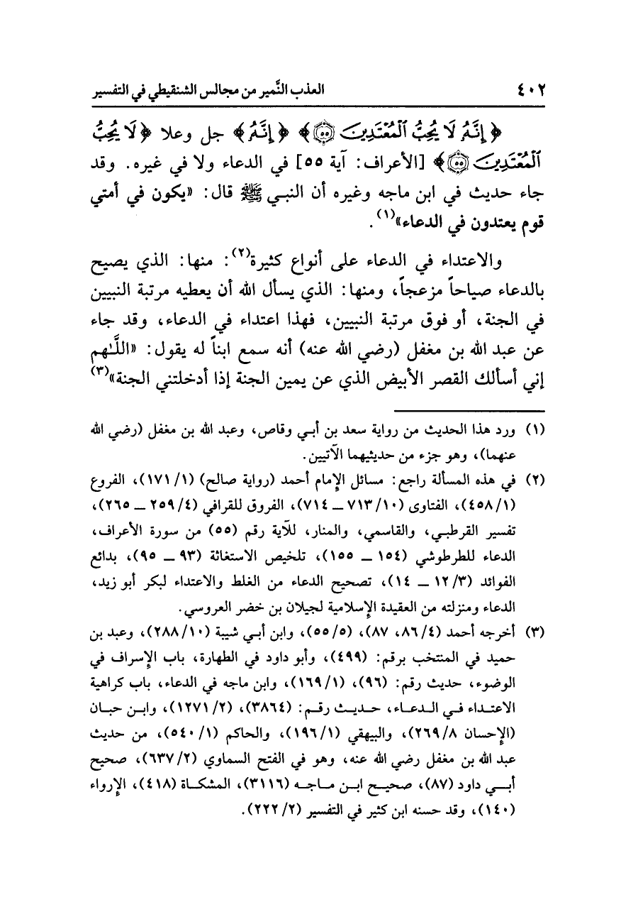 {إِنَّهُ لَا يُحِبُّ الْمُعْتَدِينَ} {إِنَّهُ} جل وعلا: {لَا يُحِبُّ الْمُعْتَدِينَ} [الأعراف: آية ٥٥] في الدعاءِ ولَا في غيرِه. وقد جاء حديثٌ في ابنِ ماجه وغيرِه أن النبيَّ صلى اللَّهُ عليه وسلم قال: «إِنَّهُ يَكُونُ فِي أُمَّتِي قَوْمٌ يَعْتَدُونَ فِي الدُّعَاءِ» (¬١).