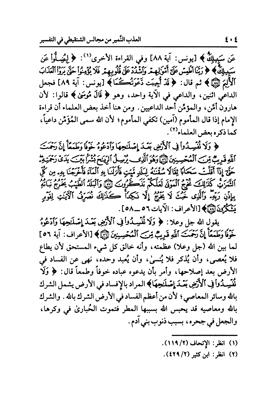 عَنْ سَبِيلِكَ} [يونس: آية ٨٨] وفي القراءةِ الأخرى (¬١): {لِيُضِلُّوا عَنْ سَبِيلِكَ} {رَبَّنَا اطْمِسْ عَلَى أَمْوَالِهِمْ وَاشْدُدْ عَلَى قُلُوبِهِمْ فَلَا يُؤْمِنُوا حَتَّى يَرَوُا الْعَذَابَ الأَلِيمَ} ثم قال: {قَالَ قَدْ أُجِيبَت دَّعْوَتُكُمَا} [يونس: آية ٨٩] فجعل الداعيَ اثنين، والداعي في الآيةِ واحدٌ، وهو {قَالَ مُوسَى} قالوا: لأن هارونَ أَمَّنَ، والمُؤمِّنُ أَحَدُ الدَّاعِيَيْنِ. ومن هنا أخذ بعضُ العلماءِ أن قراءةَ الإمامِ إذا قال المأمومُ (آمين) تَكْفِي المأمومَ؛ لأن اللَّهَ سَمَّى المُؤَمِّنَ داعيًا، كما ذَكَرَهُ بعضُ العلماءِ (¬٢).