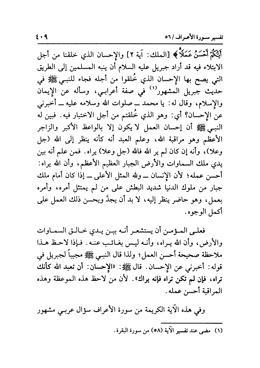 أَيُّكُمْ أَحْسَنُ عَمَلاً} [الملك: آية ٢] والإحسانُ الذي خُلِقْنَا من أَجْلِ الابتلاءِ فيه قد أَرَادَ جبريلُ عليه السلام أن يُنَبِّهَ المسلمين إلى الطريقِ التي يَصِحُّ بها الإحسانُ الذي خُلِقُوا من أَجْلِهِ فجاءَ للنبيِّ صلى الله عليه وسلم في حديثِ جبريلَ المشهورِ (¬١) في صفةِ أَعْرَابِيٍّ، وسأله عن الإيمانِ والإسلامِ، وقال له: يَا مُحَمَّدُ ... - صلواتُ اللَّهِ وسلامُه عليه - أَخْبِرْنِي عن الإحسانِ؟ أي: وهو الذي خُلِقْتُمْ من أجلِ الاختبارِ فيه. فَبَيَّنَ له النبيُّ صلى الله عليه وسلم أن إحسانَ العملِ لا يكونُ إلا بالواعظِ الأكبرِ والزاجرِ الأعظمِ وهو مراقبةُ الله، وعلم العبد أنه كأنه ينظر إلى الله (جل وعلا)، وأنه إن كان لم يَرَ اللَّهَ فَاللَّهُ (جل وعلا) يراه. فَمَنْ عَلِمَ أنه بَيْنَ يَدَيْ مَلِكِ السماواتِ والأرضِ الجبارِ العظيمِ الأعظمِ، وأن اللَّهَ يراه: أَحْسَنَ عَمَلَهُ؛ لأن الإنسانَ - وَلِلَّهِ المثلُ الأعلى - إذا كان أمامَ مَلِكٍ جبارٍ من ملوكِ الدنيا شديدِ البطشِ على مَنْ لَمْ يَمْتَثِلْ أَمْرَهُ، وَأَمَرَهُ بعملٍ، وهو حاضرٌ ينظرُ إليه، لابد أن يَجِدَّ ويحسنَ ذلك العملَ على أكملِ الوجوهِ.
