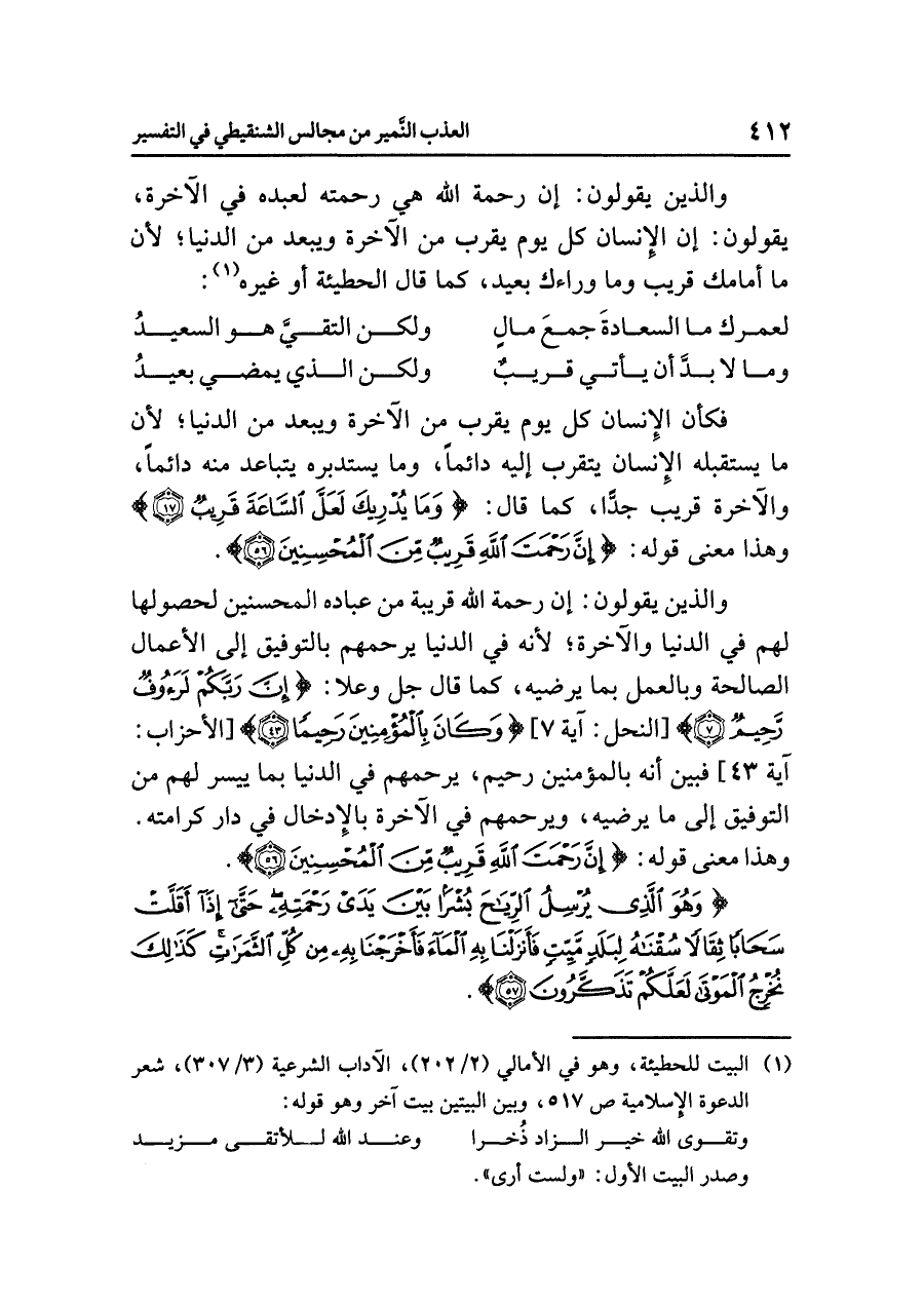 والذين يقولونَ: إن رحمةَ اللَّهِ قريبةٌ من عبادِه المحسنين بحصولِها لهم في الدنيا والآخرةِ؛ لأنه في الدنيا يرحمُهم بالتوفيقِ إلى الأعمالِ الصالحةِ وبالعملِ بما يرضيه، كما قال جل وعلا: {إِنَّ رَبَّكُمْ لَرَؤُوفٌ رَّحِيمٌ} [النحل: آية ٧] {وَكَانَ بِالْمُؤْمِنِينَ رَحِيمًا} [الأحزاب: آية ٤٣] فَبَيَّنَ أنه بالمؤمنين رحيمٌ، يرحمهم بالدنيا بما يُيَسِّرُ لهم من التوفيقِ إلى ما يُرْضِيهِ، ويرحمُهم في الآخرةِ بالإدخالِ في دارِ كرامتِه. وهذا معنَى قولِه: {إِنَّ رَحْمَةَ اللَّهِ قَرِيبٌ مِّنَ الْمُحْسِنِينَ}.