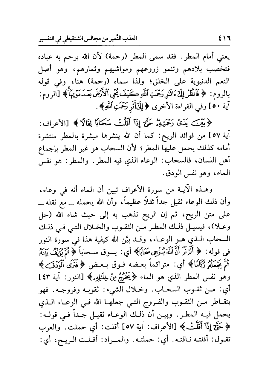 وهذه الآيةُ من سورةِ الأعرافِ تُبَيِّنُ أن الماءَ أنه في وعاءٍ، وأن ذلك الوعاءَ ثقيلٌ جِدًّا ثقلاً عظيمًا، وأن اللَّهَ يحملُه - مع ثقلِه - على متنِ الريحِ، ثم إن الريحَ تَذْهَبُ به إلى حيثُ شاءَ اللَّهُ (جل وعلا)، فيسيلُ ذلك المطرُ من الثقوبِ والخلالِ التي في ذلك السحابِ الذي هو الوعاءُ، وقد بيَّن اللَّهُ كيفيةَ هذا في سورةِ النورِ في قولِه: {أَلَمْ تَرَ أَنَّ اللَّهَ يُزْجِي سَحَابًا} أي: يسوقُ سحابًا: {ثُمَّ يُؤَلِّفُ بَيْنَهُ ثُمَّ يَجْعَلُهُ رُكَامًا} أي: مُتَرَاكمًا بعضَه فوقَ بعضٍ {فَتَرَى الْوَدْقَ} وهو نفسُ المطرِ الذي هو الماءُ {يَخْرُجُ مِنْ خِلَالِهِ} [النور: آية ٤٣] أي: من ثقوبِ السحابِ. وخلالُ الشيءِ: ثقوبُه وفروجُه. فهو يتقاطرُ من الثقوبِ والفروجِ التي جَعَلَهَا اللَّهُ في الوعاءِ الذي يحملُ فيه المطر. وَبَيَّنَ أن ذلك الوعاءَ ثقيلٌ جِدًّا في قولِه: {حَتَّى إِذَا أَقَلَّتْ} [الأعراف: آية ٥٧] أَقَلَّتْ: أي حَمَلَتْ. والعربُ تقولُ. أَقَلَّتْهُ ناقتُه. أي: حَمَلَتْهُ. والمرادُ: أَقَلَّتِ الريحَ، أي: